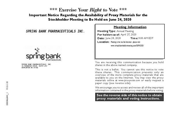 See the reverse side of this notice to obtain proxy materials and voting instructions. *** Exercise Your Right to Vote *** Important Notice Regarding the Availability of Proxy Materials for the Stockholder Meeting to Be Held on <mtgdate>. You are receiving this communication because you hold shares in the above named company. This is not a ballot. You cannot use this notice to vote these shares. This communication presents only an overview of the more complete proxy materials that are available to you on the Internet. You may view the proxy materials online at www.proxyvote.com or easily request a paper copy (see reverse side). We encourage you to access and review all of the important information contained in the proxy materials before voting. Meeting Information Meeting Type: <mtgtype> For holders as of: <recdate> Date: Time: <mtgtime> Location: 0000466441_1 R1.0.1.18 SPRING BANK PHARMACEUTICALS INC. SPRING BANK PHARMACEUTICALS, INC. 35 PARKWOOD DRIVE, SUITE 210 HOPKINTON MA 01748 Annual Meeting April 27, 2020 June 24, 2020 June 24, 2020 9:00 AM EDT Meeting is live via the Internet - please visit www.virtualshareholdermeeting.com/SBPH2020