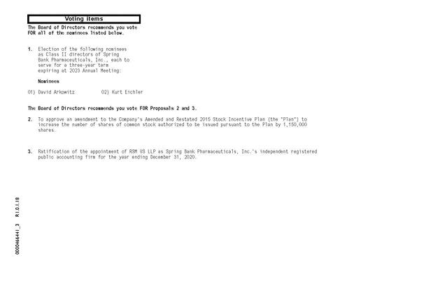 Voting items 0000466441_3 R1.0.1.18 The Board of Directors recommends you vote FOR all of the nominees listed below. 1. Election of the following nominees as Class II directors of Spring Bank Pharmaceuticals, Inc., each to serve for a three-year term expiring at 2023 Annual Meeting: Nominees 01) David Arkowitz 02) Kurt Eichler The Board of Directors recommends you vote FOR Proposals 2 and 3. 2. To approve an amendment to the Company's Amended and Restated 2015 Stock Incentive Plan (the "Plan") to increase the number of shares of common stock authorized to be issued pursuant to the Plan by 1,150,000 shares. 3. Ratification of the appointment of RSM US LLP as Spring Bank Pharmaceuticals, Inc.'s independent registered public accounting firm for the year ending December 31, 2020. 0000466441_4 R1.0.1.18