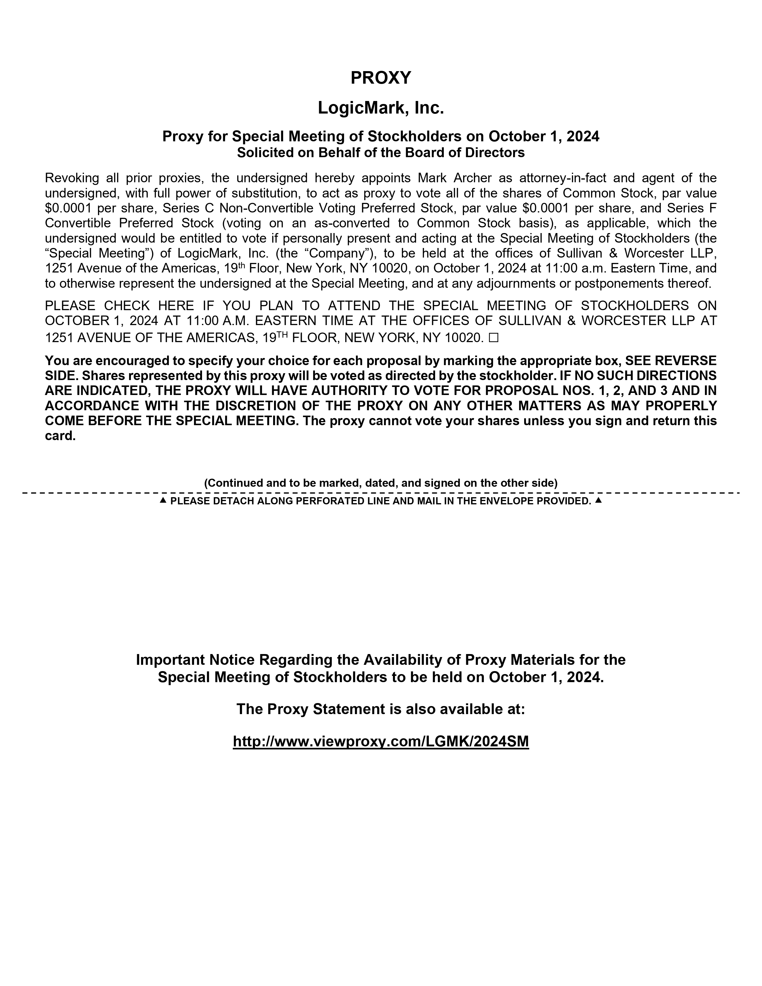 NOTICE IS HEREBY GIVEN that a Special Meeting of Stockholders (“Special Meeting”) of LogicMark, Inc., a Nevada corporation (the “Company”), will be held on October 1, 2024 at 11:00 a.m. (Eastern Time) in the offices of Sullivan & Worcester LLP at 1251 Avenue of the Americas, 19th Floor, New York, NY 10020. The Special Meeting is being held for the following purposes: