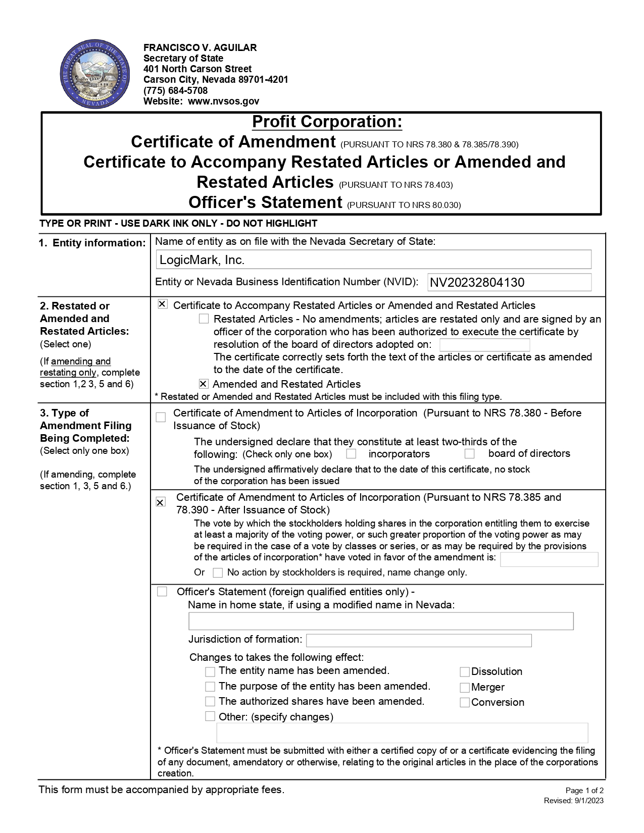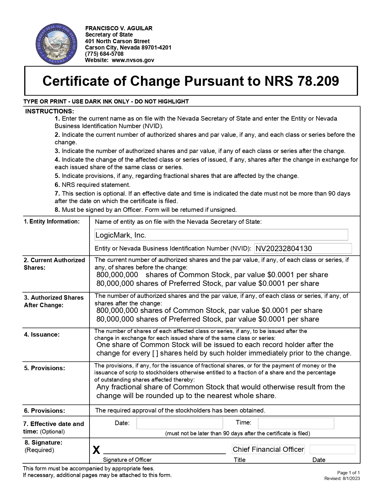 The undersigned, Mark Archer, Chief Financial Officer of LogicMark, Inc. (the “Corporation”), pursuant to the provisions of the Nevada Revised Statutes of the State of Nevada, does hereby certify and set forth as follows: