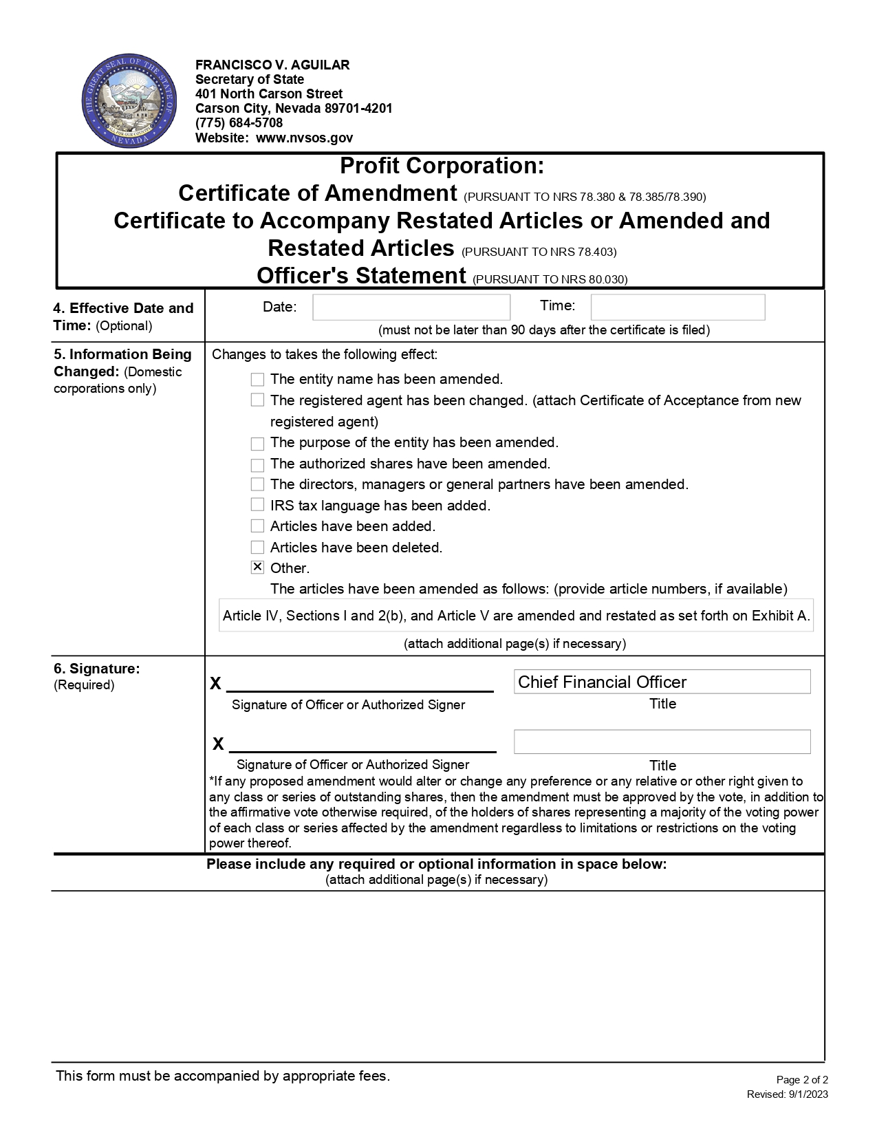 The Certificate of Amendment will become effective upon its filing with the Secretary of State of the State of Nevada pursuant to NRS 78.390 and will reflect the updated language above. The text of the form of Certificate of Amendment is substantially as set forth in Appendix C to this Proxy Statement. The text of such form of Certificate of Amendment accompanying this Proxy Statement is, however, subject to modification to reflect any changes that may be required by the office of the Secretary of State of the State of Nevada, or that the Board may determine to be necessary or advisable ultimately to comply with applicable laws.