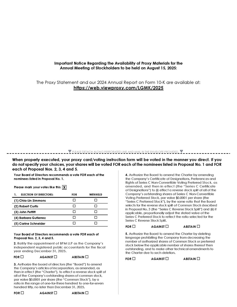 PLEASE DETACH ALONG PERFORATED LINE AND MAIL IN THE ENVELOPE PROVIDED. Important Notice Regarding the Availability of Proxy Materials for the Annual Meeting of Stockholders to be held on August 15, 2025: The Proxy Statement and our 2024 Annual Report on Form 10 - K are available at: https://web.viewproxy.com/LGMK/2025 When properly executed, your proxy card/voting instruction form will be voted in the manner you direct. If you do not specify your choices, your shares will be voted FOR each of the nominees listed in Proposal No. 1 and FOR each of Proposal Nos. 2, 3, 4 and 5. Your Board of Directors recommends a vote FOR each of the nominees listed in Proposal No. 1. Please mark your votes like this WITHHELD FOR 1. ELECTION OF DIRECTORS: տ տ (1) Chia - Lin Simmons տ տ (2) Robert Curtis տ տ (3) John Pettitt տ տ (4) Barbara Gutierrez տ տ (5) Carine Schneider Your Board of Directors recommends a vote FOR each of Proposal Nos. 2, 3, 4 and 5. 2. Ratify the appointment of BPM LLP as the Company’s independent registered public accountants for the fiscal year ending December 31, 2025. FOR տ AGAINST տ ABSTAIN տ 3. Authorize the board of directors (the “Board”) to amend the Company’s articles of incorporation, as amended, as then in effect (the “Charter”), to effect a reverse stock split of all of the Company’s outstanding shares of common stock, par value $0.0001 per share (the “Common Stock”), by a ratio in the range of one - for - three hundred to one - for - seven hundred fifty, no later than December 31, 2025. FOR տ AGAINST տ ABSTAIN տ 4. Authorize the Board to amend the Charter by amending the Company’s Certificate of Designations, Preferences and Rights of Series C Non - Convertible Voting Preferred Stock, as amended, and then in effect (the “Series C Certificate of Designations”) to (i) effect a reverse stock split of all of the Company’s outstanding shares of Series C Non - Convertible Voting Preferred Stock, par value $0.0001 per share (the “Series C Preferred Stock”), by the same ratio that the Board selects for the reverse stock split of Common Stock described in Proposal No. 3 (the “Series C Reverse Stock Split”) and (ii) if applicable, proportionally adjust the stated value of the Series C Preferred Stock to reflect the ratio selected for the Series C Reverse Stock Split. FOR տ AGAINST տ ABSTAIN տ 5. Authorize the Board to amend the Charter by deleting language prohibiting the Company from decreasing the number of authorized shares of Common Stock or preferred stock below the applicable number of shares thereof then outstanding, and to make other technical amendments to the Charter due to such deletion. FOR տ AGAINST տ ABSTAIN տ