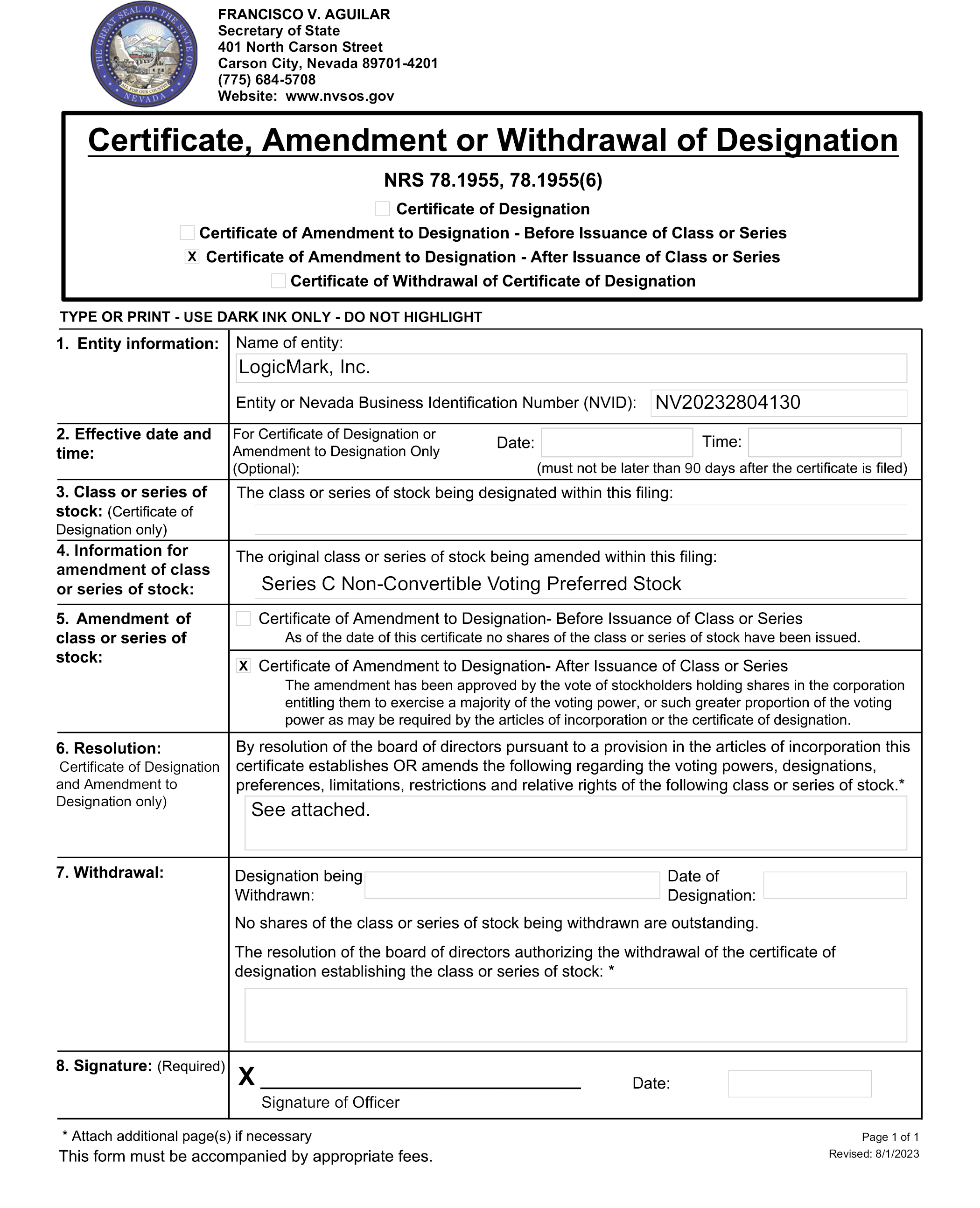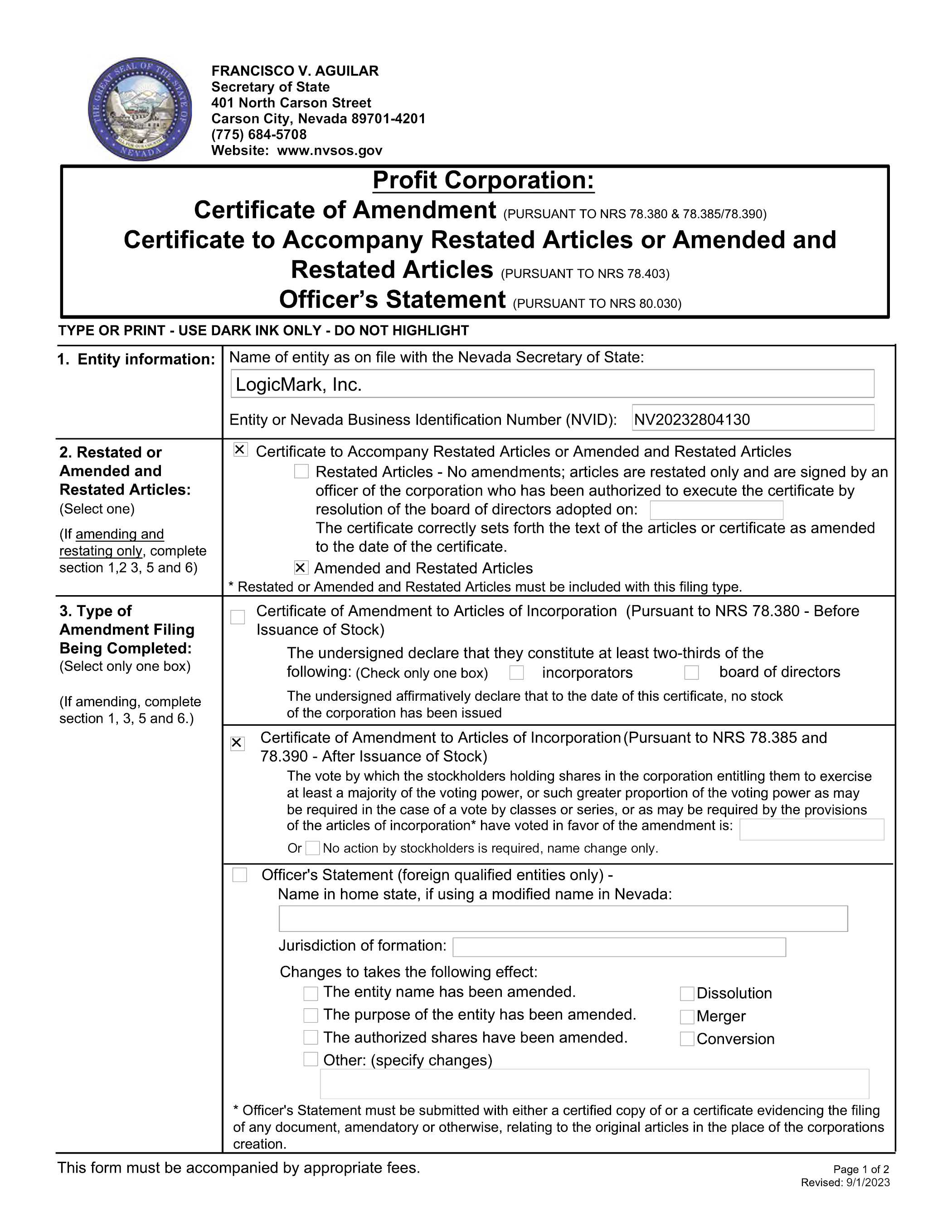 The Certificate of Amendment will become effective upon its filing with the Secretary of State of the State of Nevada pursuant to NRS 78.390 and will reflect the updated language above. The text of the form of Certificate of Amendment is substantially as set forth in Appendix C to this Proxy Statement. The text of such form of Certificate of Amendment accompanying this Proxy Statement is, however, subject to modification to reflect any changes that may be required by the office of the Secretary of State of the State of Nevada, or that the Board may determine to be necessary or advisable ultimately to comply with applicable laws.