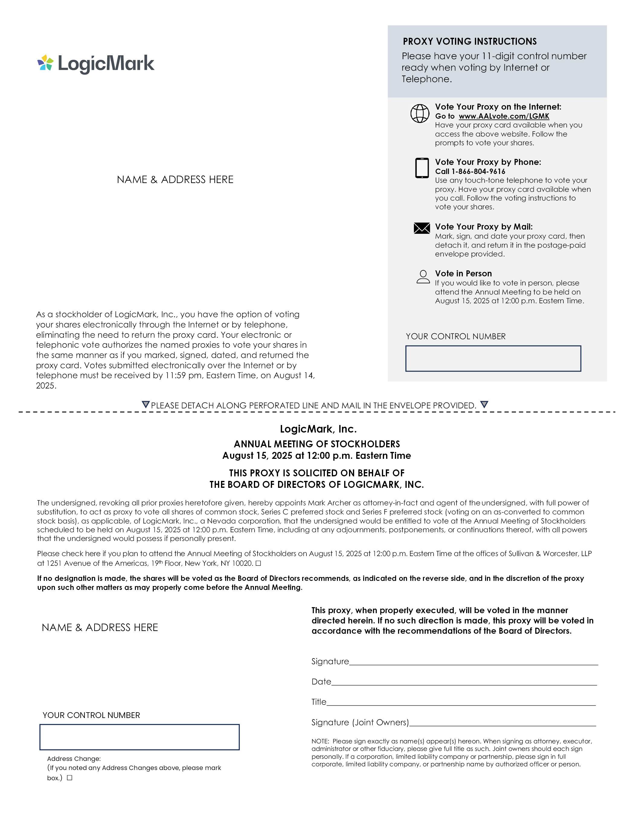 PROXY VOTING INSTRUCTIONS NAME & ADDRESS HERE Please have your 11-digit control number ready when voting by Internet or Telephone. Vote Your Proxy on the Internet: Go to www.AALvote.com/LGMK Have your proxy card available when you access the above website. Follow the prompts to vote your shares. Vote Your Proxy by Phone: Call 1-866-804-9616 Use any touch-tone telephone to vote your proxy. Have your proxy card available when you call. Follow the voting instructions to vote your shares Vote Your Proxy by Mail: Mark, sign, and date your proxy card, then detach it, and return it in the postage-paid envelope provided. Vote in Person If you would like to vote in person, please attend the Annual Meeting to be held on August 15, 2025 at 12:00 p.m. Eastern Time. YOUR CONTROL NUMBER As a stockholder of LogicMark, Inc., you have the option of voting your shares electronically through the Internet or by telephone, eliminating the need to return the proxy card. Your electronic or telephonic vote authorizes the named proxies to vote your shares in the same manner as if you marked, signed, dated, and returned the proxy card. Votes submitted electronically over the Internet or by telephone must be received by 11:59 pm, Eastern Time, on August 14, 2025. PLEASE DETACH ALONG PERFORATED LINE AND MAIL IN THE ENVELOPE PROVIDED. LogicMark, Inc. ANNUAL MEETING OF STOCKHOLDERS August 15, 2025 at 12:00 p.m. Eastern Time THIS PROXY IS SOLICITED ON BEHALF OF THE BOARD OF DIRECTORS OF LOGICMARK, INC. The undersigned, revoking all prior proxies heretofore given, hereby appoints Mark Archer as attorney-in-fact and agent of the undersigned, with full power of substitution, to act as proxy to vote all shares of common stock, Series C preferred stock and Series F preferred stock (voting on an as-converted to common stock basis), as applicable, of LogicMark, Inc., a Nevada corporation, that the undersigned would be entitled to vote at the Annual Meeting of Stockholders scheduled to be held on August 15, 2025 at 12:00 p.m. Eastern Time, including at any adjournments, postponements, or continuations thereof, with all powers that the undersigned would possess if personally present. Please check here if you plan to attend the Annual Meeting of Stockholders on August 15, 2025 at 12:00 p.m. Eastern Time at the offices of Sullivan & Worcester, LLP at 1251 Avenue of the Americas, 19th Floor, New York, NY 10020. If no designation is made, the shares will be voted as the Board of Directors recommends, as indicated on the reverse side, and in the discretion of the proxy upon such other matters as may properly come before the Annual Meeting. NAME & ADDRESS HERE This proxy, when properly executed, will be voted in the manner directed herein. If no such direction is made, this proxy will be voted in accordance with the recommendations of the Board of Directors. Signature Date Title Signature (Joint Owners) YOUR CONTROL NUMBER NOTE: Please sign exactly as name(s) appear(s) hereon. When signing as attorney, executor, administrator or other fiduciary, please give full title as such. Joint owners should each sign personally. If a corporation, limited liability company or partnership, please sign in full corporate, limited liability company, or partnership name by authorized officer or person. Address Change: (If you noted any Address Changes above, please mark box.)