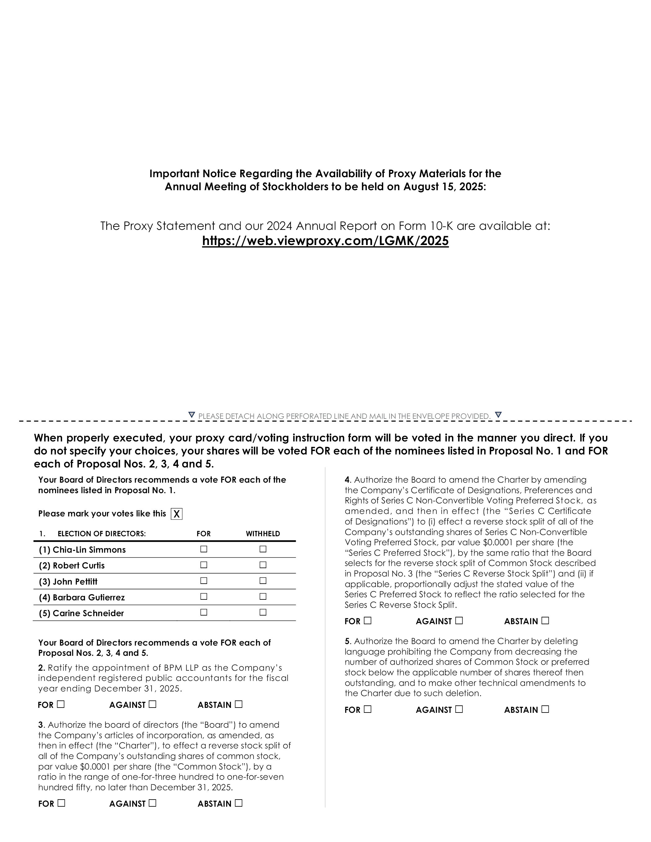 Important Notice Regarding the Availability of Proxy Materials for the Annual Meeting of Stockholders to be held on August 15, 2025: The Proxy Statement and our 2024 Annual Report on Form 10-K are available at: https://web.viewproxy.com/LGMK/2025 PLEASE DETACH ALONG PERFORATED LINE AND MAIL IN THE ENVELOPE PROVIDED When properly executed, your proxy card/voting instruction form will be voted in the manner you direct. If you do not specify your choices, your shares will be voted FOR each of the nominees listed in Proposal No. 1 and FOR each of Proposal Nos. 2, 3, 4 and 5. Your Board of Directors recommends a vote FOR each of the nominees listed in Proposal No. 1. Please mark your votes like this 1. ELECTION OF DIRECTORS: FOR WITHHELD (1) Chia-Lin Simmons (2) Robert Curtis (3) John Pettitt (4) Barbara Gutierrez (5) Carine Schneider Your Board of Directors recommends a vote FOR each of Proposal Nos. 2, 3, 4 and 5. 2. Ratify the appointment of BPM LLP as the Company’s independent registered public accountants for the fiscal year ending December 31, 2025. FOR AGAINST ABSTAIN 3. Authorize the board of directors (the “Board”) to amend the Company’s articles of incorporation, as amended, as then in effect (the “Charter”), to effect a reverse stock split of all of the Company’s outstanding shares of common stock, par value $0.0001 per share (the “Common Stock”), by a ratio in the range of one-for-three hundred to one-for-seven hundred fifty, no later than December 31, 2025. 4. Authorize the Board to amend the Charter by amending the Company’s Certificate of Designations, Preferences and Rights of Series C Non-Convertible Voting Preferred Stock, as amended, and then in effect (the “Series C Certificate of Designations”) to (i) effect a reverse stock split of all of the Company’s outstanding shares of Series C Non-Convertible Voting Preferred Stock, par value $0.0001 per share (the “Series C Preferred Stock”), by the same ratio that the Board selects for the reverse stock split of Common Stock described in Proposal No. 3 (the “Series C Reverse Stock Split”) and (ii) if applicable, proportionally adjust the stated value of the Series C Preferred Stock to reflect the ratio selected for the Series C Reverse Stock Split. 5. Authorize the Board to amend the Charter by deleting language prohibiting the Company from decreasing the number of authorized shares of Common Stock or preferred stock below the applicable number of shares thereof then outstanding, and to make other technical amendments to the Charter due to such deletion.