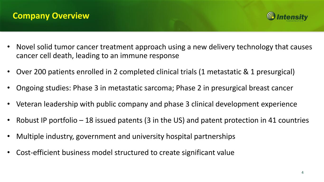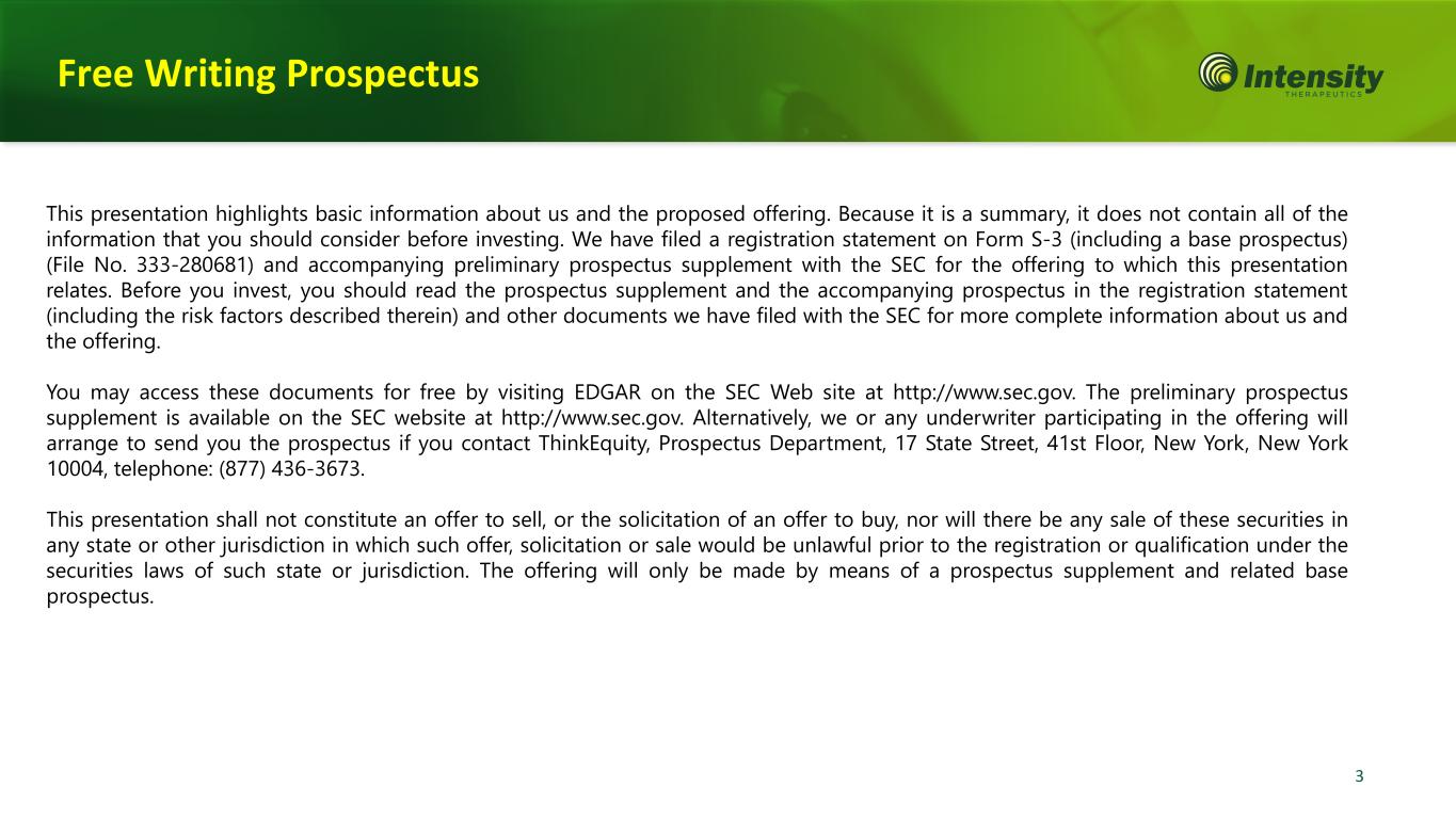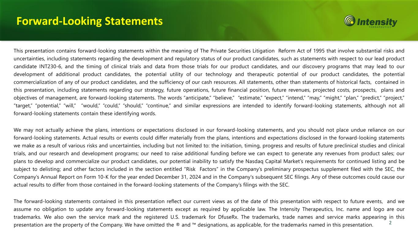 2 2 This presentation contains forward‐looking statements within the meaning of The Private Securities Litigation Reform Act of 1995 that involve substantial risks and uncertainties, including statements regarding the development and regulatory status of our product candidates, such as statements with respect to our lead product candidate INT230‐6, and the timing of clinical trials and data from those trials for our product candidates, and our discovery programs that may lead to our development of additional product candidates, the potential utility of our technology and therapeutic potential of our product candidates, the potential commercialization of any of our product candidates, and the sufficiency of our cash resources. All statements, other than statements of historical facts, contained in this presentation, including statements regarding our strategy, future operations, future financial position, future revenues, projected costs, prospects, plans and objectives of management, are forward‐looking statements. The words “anticipate,” “believe,” “estimate,” “expect,” “intend,” “may,” “might,” “plan,” “predict,” “project,” “target,” “potential,” “will,” “would,” “could,” “should,” “continue,” and similar expressions are intended to identify forward‐looking statements, although not all forward‐looking statements contain these identifying words. We may not actually achieve the plans, intentions or expectations disclosed in our forward‐looking statements, and you should not place undue reliance on our forward‐looking statements. Actual results or events could differ materially from the plans, intentions and expectations disclosed in the forward‐looking statements we make as a result of various risks and uncertainties, including but not limited to: the initiation, timing, progress and results of future preclinical studies and clinical trials, and our research and development programs; our need to raise additional funding before we can expect to generate any revenues from product sales; our plans to develop and commercialize our product candidates, our potential inability to satisfy the Nasdaq Capital Market’s requirements for continued listing and be subject to delisting; and other factors included in the section entitled “Risk Factors” in the Company’s preliminary prospectus supplement filed with the SEC, the Company’s Annual Report on Form 10‐K for the year ended December 31, 2024 and in the Company's subsequent SEC filings. Any of these outcomes could cause our actual results to differ from those contained in the forward‐looking statements of the Company’s filings with the SEC. The forward‐looking statements contained in this presentation reflect our current views as of the date of this presentation with respect to future events, and we assume no obligation to update any forward‐looking statements except as required by applicable law. The Intensity Therapeutics, Inc. name and logo are our trademarks. We also own the service mark and the registered U.S. trademark for DfuseRx. The trademarks, trade names and service marks appearing in this presentation are the property of the Company. We have omitted the ® and designations, as applicable, for the trademarks named in this presentation. Forward-Looking Statements