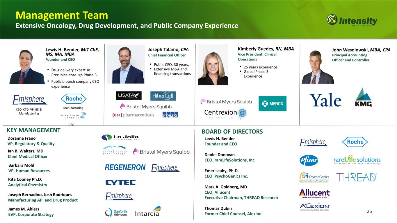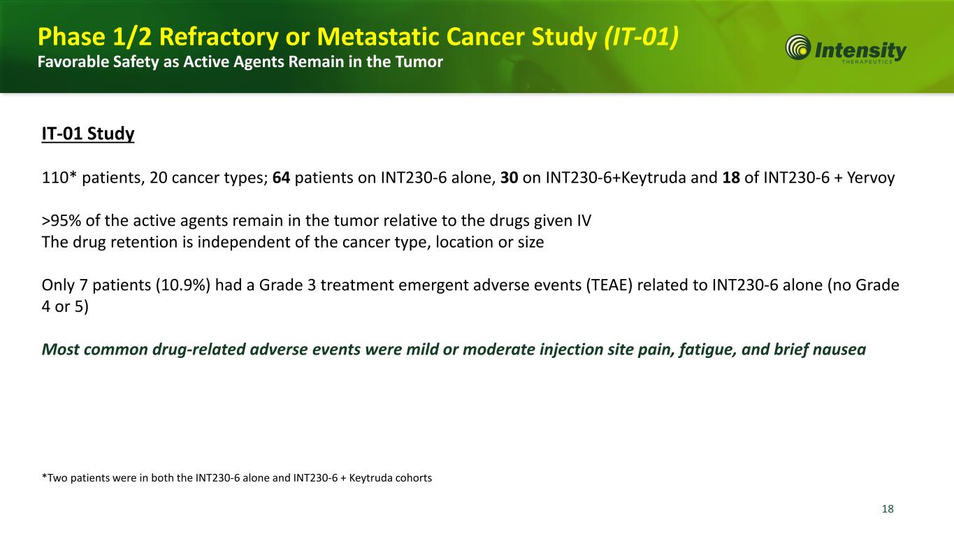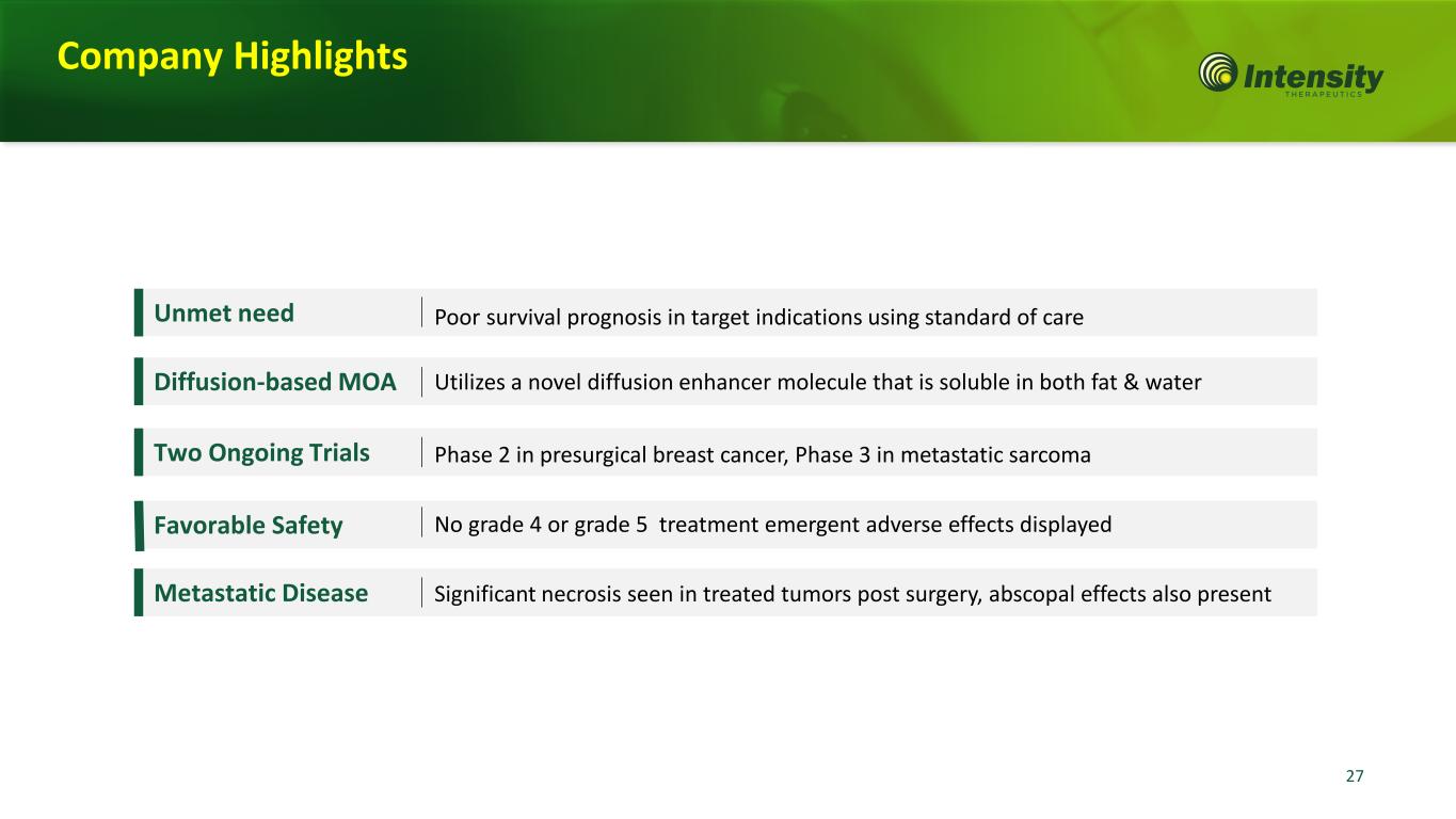2 2 This presentation contains forward‐looking statements within the meaning of The Private Securities Litigation Reform Act of 1995 that involve substantial risks and uncertainties, including statements regarding the development and regulatory status of our product candidates, such as statements with respect to our lead product candidate INT230‐6, and the timing of clinical trials and data from those trials for our product candidates, and our discovery programs that may lead to our development of additional product candidates, the potential utility of our technology and therapeutic potential of our product candidates, the potential commercialization of any of our product candidates, and the sufficiency of our cash resources. All statements, other than statements of historical facts, contained in this presentation, including statements regarding our strategy, future operations, future financial position, future revenues, projected costs, prospects, plans and objectives of management, are forward‐looking statements. The words “anticipate,” “believe,” “estimate,” “expect,” “intend,” “may,” “might,” “plan,” “predict,” “project,” “target,” “potential,” “will,” “would,” “could,” “should,” “continue,” and similar expressions are intended to identify forward‐looking statements, although not all forward‐looking statements contain these identifying words. We may not actually achieve the plans, intentions or expectations disclosed in our forward‐looking statements, and you should not place undue reliance on our forward‐looking statements. Actual results or events could differ materially from the plans, intentions and expectations disclosed in the forward‐looking statements we make as a result of various risks and uncertainties, including but not limited to: the initiation, timing, progress and results of future preclinical studies and clinical trials, and our research and development programs; our need to raise additional funding before we can expect to generate any revenues from product sales; our plans to develop and commercialize our product candidates, our potential inability to satisfy the Nasdaq Capital Market’s requirements for continued listing and be subject to delisting; and other factors included in the section entitled “Risk Factors” in the Company’s preliminary prospectus supplement filed with the SEC, the Company’s Annual Report on Form 10‐K for the year ended December 31, 2024 and in the Company's subsequent SEC filings. Any of these outcomes could cause our actual results to differ from those contained in the forward‐looking statements of the Company’s filings with the SEC. The forward‐looking statements contained in this presentation reflect our current views as of the date of this presentation with respect to future events, and we assume no obligation to update any forward‐looking statements except as required by applicable law. The Intensity Therapeutics, Inc. name and logo are our trademarks. We also own the service mark and the registered U.S. trademark for DfuseRx. The trademarks, trade names and service marks appearing in this presentation are the property of the Company. We have omitted the ® and designations, as applicable, for the trademarks named in this presentation. Forward-Looking Statements