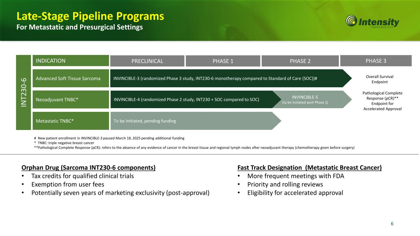 6 Orphan Drug (Sarcoma INT230-6 components) • Tax credits for qualified clinical trials • Exemption from user fees • Potentially seven years of marketing exclusivity (post-approval) To be initiated, pending funding INVINCIBLE-5 (to be initiated post Phase 2) INVINCIBLE-4 (randomized Phase 2 study, INT230 + SOC compared to SOC) INVINCIBLE-3 (randomized Phase 3 study, INT230-6 monotherapy compared to Standard of Care (SOC))# INDICATION IN T2 30 -6 # New patient enrollment in INVINCIBLE-3 paused March 18, 2025 pending additional funding * TNBC: triple negative breast cancer **Pathological Complete Response (pCR): refers to the absence of any evidence of cancer in the breast tissue and regional lymph nodes after neoadjuvant therapy (chemotherapy given before surgery) Fast Track Designation (Metastatic Breast Cancer) • More frequent meetings with FDA • Priority and rolling reviews • Eligibility for accelerated approval Late-Stage Pipeline Programs For Metastatic and Presurgical Settings PRECLINICAL PHASE 1 PHASE 2 PHASE 3 Advanced Soft Tissue Sarcoma Neoadjuvant TNBC* Metastatic TNBC* Overall Survival Endpoint Pathological Complete Response (pCR)** Endpoint for Accelerated Approval