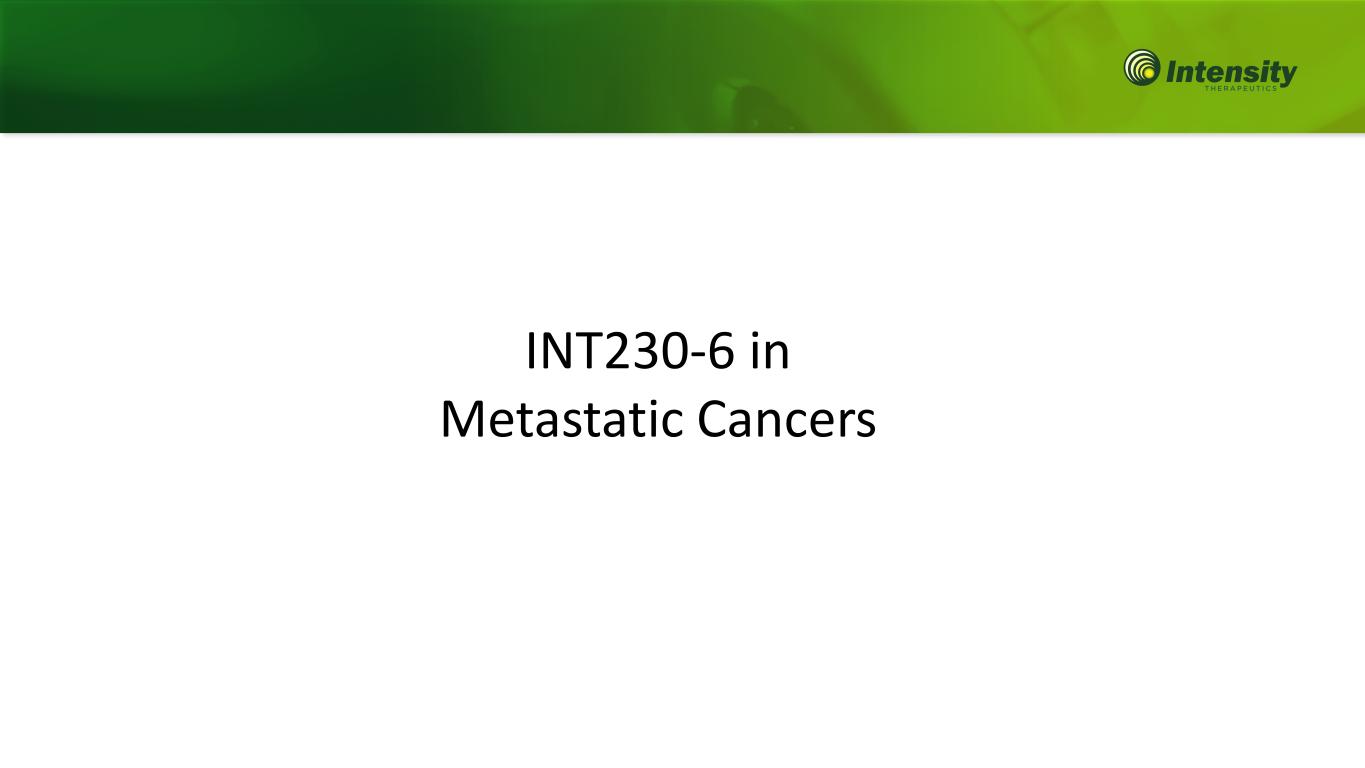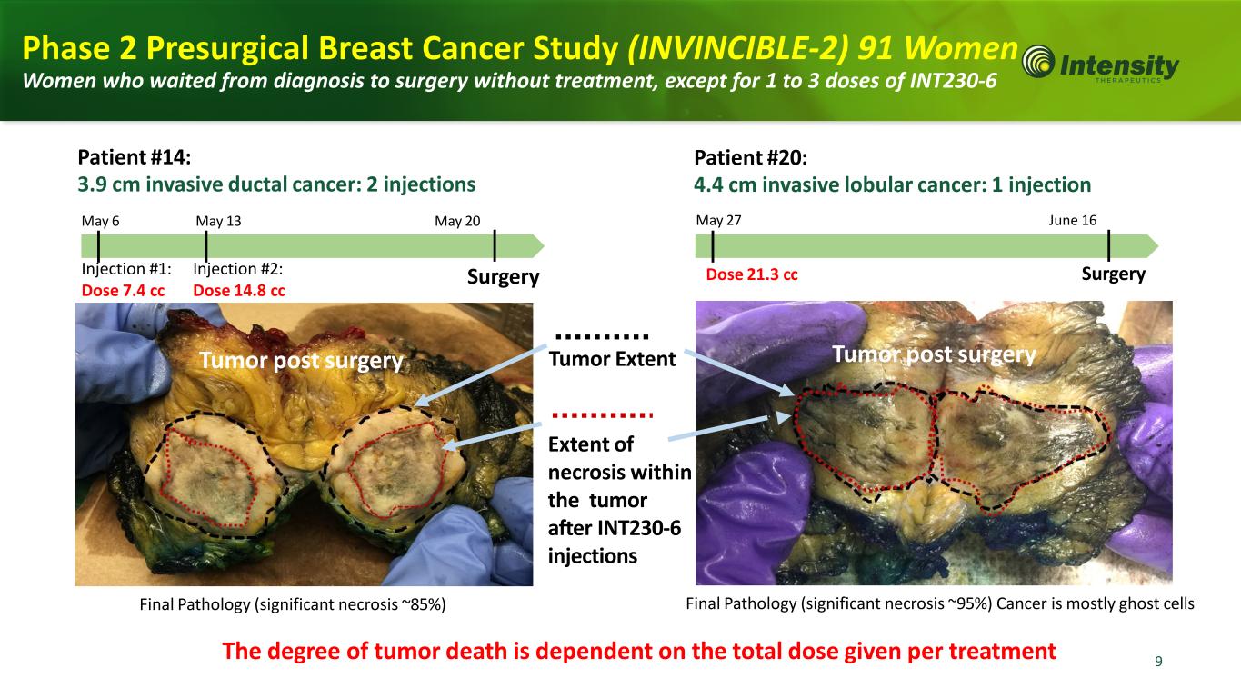 8 *Tumors contain high percentages of fat and are under high pressure CYTOTOXICS DRUG + dye in water Little to no drug dispersion in all tumors tested TUMOR cut in half Significant drug leakage Human pancreatic cancer in mouse model Drug NOT absorbed Human pancreatic cancer in mouse model TUMOR cut in half Significant dispersion in all tumors tested No leakage INT230-6: Fully absorbed INT230-6 + dye in water Dose is set by a tumor’s volume or diameter TUMOR TUMOR Intensity Publication INT230-6: A Unique Anti-Cancer Therapy A Water Solution That Kills Fatty or Stromal Tumors and Does Not Harm Healthy Tissue