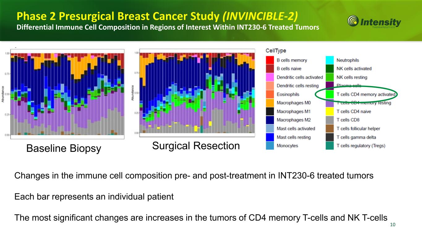 9 9 Tumor Extent Extent of necrosis within the tumor after INT230-6 injections Patient #14: 3.9 cm invasive ductal cancer: 2 injections May 6 May 13 May 20 Final Pathology (significant necrosis ~85%) Final Pathology (significant necrosis ~95%) Cancer is mostly ghost cells Injection #1: Dose 7.4 cc Injection #2: Dose 14.8 cc Surgery Patient #20: 4.4 cm invasive lobular cancer: 1 injection May 27 June 16 Dose 21.3 cc Surgery The degree of tumor death is dependent on the total dose given per treatment Tumor post surgery Tumor post surgery Phase 2 Presurgical Breast Cancer Study (INVINCIBLE-2) 91 Women Women who waited from diagnosis to surgery without treatment, except for 1 to 3 doses of INT230-6