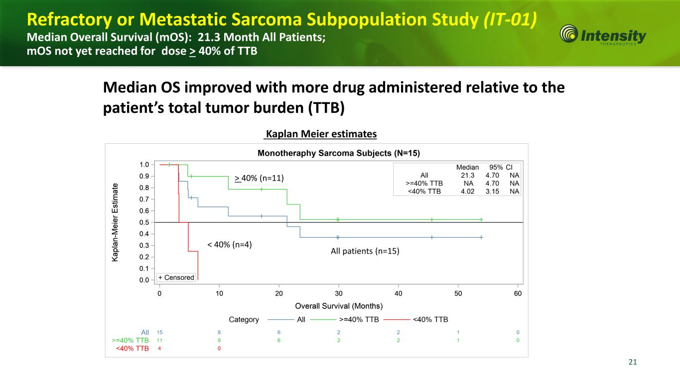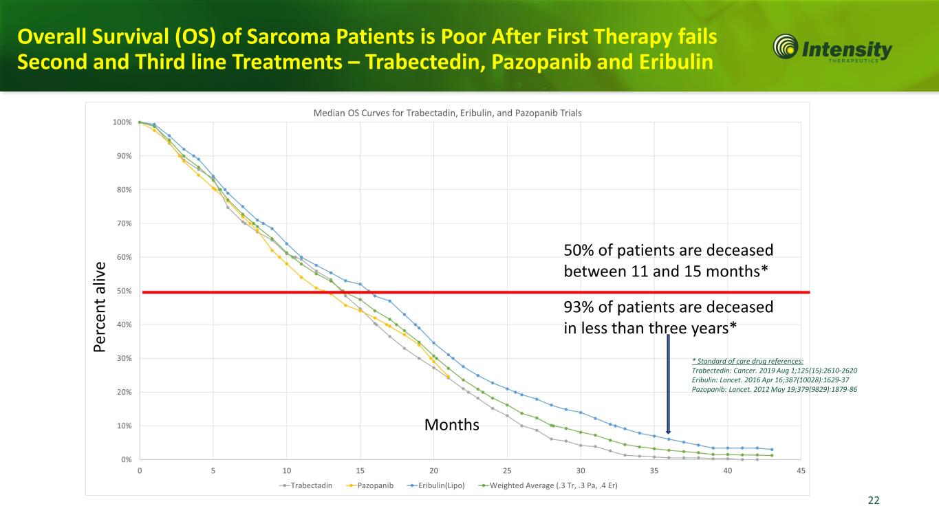 21 Kaplan Meier estimates Median OS improved with more drug administered relative to the patient’s total tumor burden (TTB) > 40% (n=11) All patients (n=15) < 40% (n=4) Refractory or Metastatic Sarcoma Subpopulation Study (IT-01) Median Overall Survival (mOS): 21.3 Month All Patients; mOS not yet reached for dose > 40% of TTB