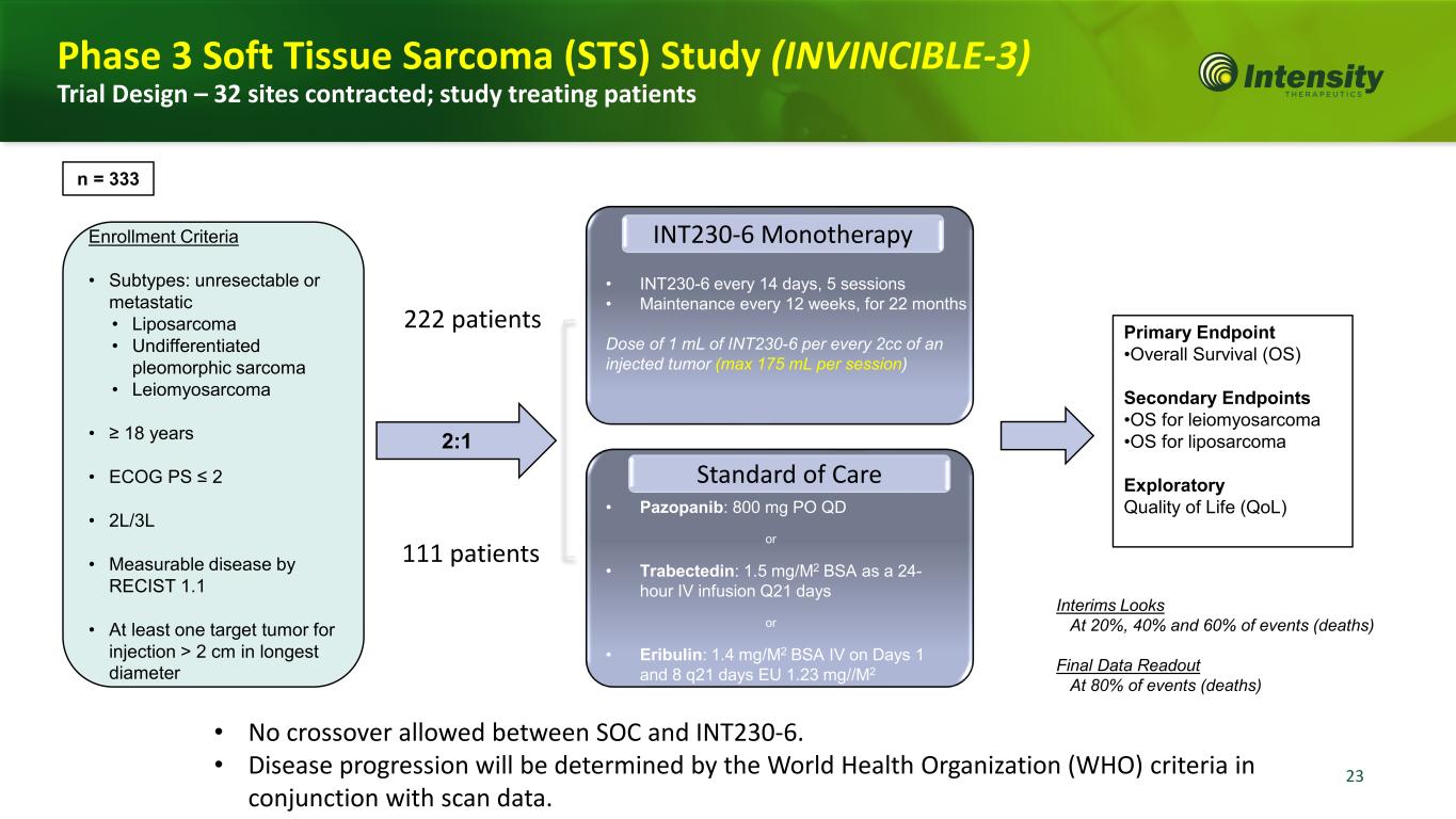 23 Interims Looks At 20%, 40% and 60% of events (deaths) Final Data Readout At 80% of events (deaths) Enrollment Criteria • Subtypes: unresectable or metastatic • Liposarcoma • Undifferentiated pleomorphic sarcoma • Leiomyosarcoma • ≥ 18 years • ECOG PS ≤ 2 • 2L/3L • Measurable disease by RECIST 1.1 • At least one target tumor for injection > 2 cm in longest diameter 2:1 Primary Endpoint •Overall Survival (OS) Secondary Endpoints •OS for leiomyosarcoma •OS for liposarcoma Exploratory Quality of Life (QoL) n = 333 • Pazopanib: 800 mg PO QD or • Trabectedin: 1.5 mg/M2 BSA as a 24- hour IV infusion Q21 days or • Eribulin: 1.4 mg/M2 BSA IV on Days 1 and 8 q21 days EU 1.23 mg//M2 Standard of Care INT230-6 Monotherapy • INT230-6 every 14 days, 5 sessions • Maintenance every 12 weeks, for 22 months Dose of 1 mL of INT230-6 per every 2cc of an injected tumor (max 175 mL per session) 222 patients 111 patients Phase 3 Soft Tissue Sarcoma (STS) Study (INVINCIBLE-3) Trial Design – 32 sites contracted; study treating patients • No crossover allowed between SOC and INT230-6. • Disease progression will be determined by the World Health Organization (WHO) criteria in conjunction with scan data.