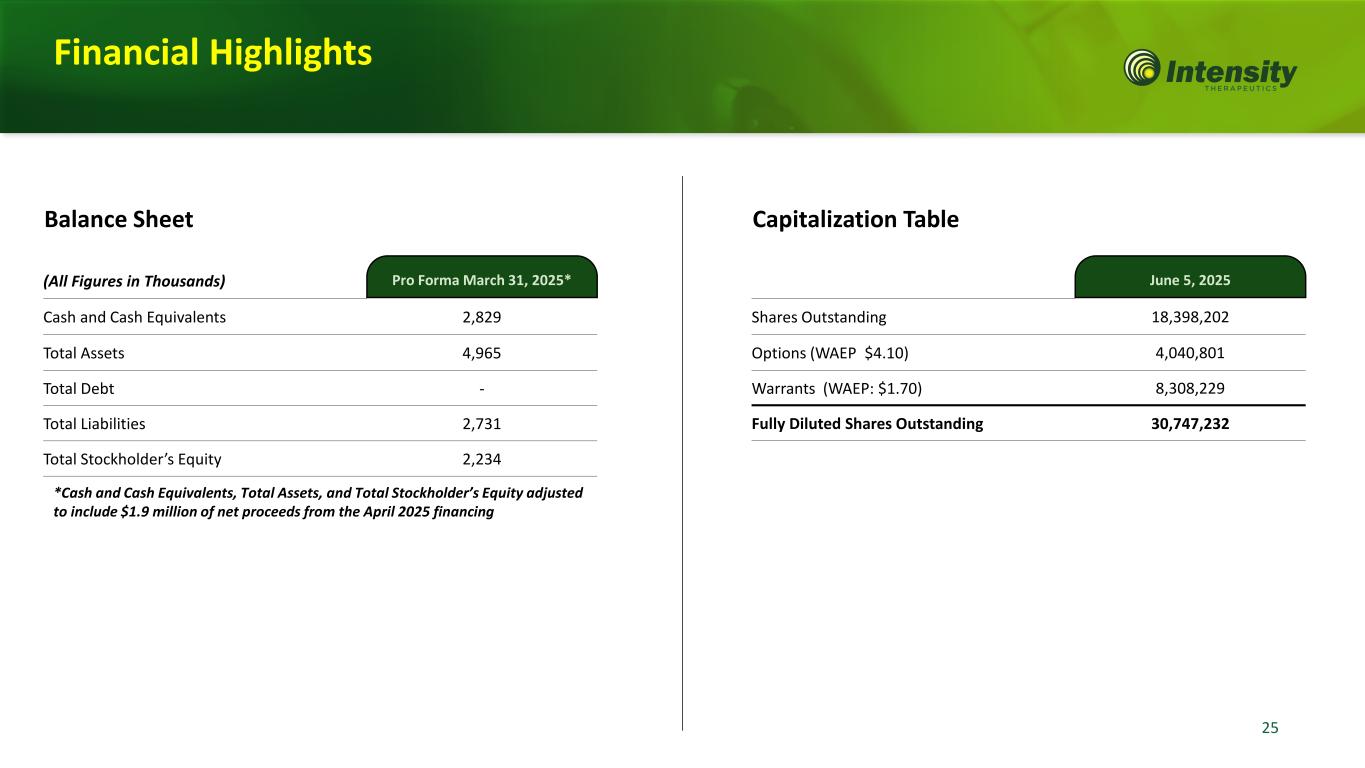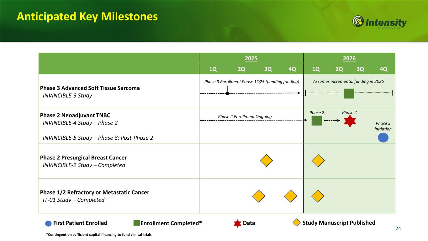 24 2025 2026 1Q 2Q 3Q 4Q 1Q 2Q 3Q 4Q Phase 3 Advanced Soft Tissue Sarcoma INVINCIBLE-3 Study Phase 2 Neoadjuvant TNBC INVINCIBLE-4 Study – Phase 2 INVINCIBLE-5 Study – Phase 3: Post-Phase 2 Phase 2 Presurgical Breast Cancer INVINCIBLE-2 Study – Completed Phase 1/2 Refractory or Metastatic Cancer IT-01 Study – Completed First Patient Enrolled Enrollment Completed* Data Phase 2 Phase 3 Initiation Phase 2 Study Manuscript Published Assumes incremental funding in 2025 Anticipated Key Milestones Phase 2 Enrollment Ongoing Phase 3 Enrollment Pause 1Q25 (pending funding) *Contingent on sufficient capital financing to fund clinical trials