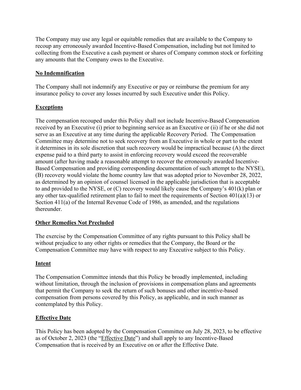 The Company may use any legal or equitable remedies that are available to the Company to recoup any erroneously awarded Incentive-Based Compensation, including but not limited to collecting from the Executive a cash payment or shares of Company common stock or forfeiting any amounts that the Company owes to the Executive. No Indemnification The Company shall not indemnify any Executive or pay or reimburse the premium for any insurance policy to cover any losses incurred by such Executive under this Policy. Exceptions The compensation recouped under this Policy shall not include Incentive-Based Compensation received by an Executive (i) prior to beginning service as an Executive or (ii) if he or she did not serve as an Executive at any time during the applicable Recovery Period. The Compensation Committee may determine not to seek recovery from an Executive in whole or part to the extent it determines in its sole discretion that such recovery would be impractical because (A) the direct expense paid to a third party to assist in enforcing recovery would exceed the recoverable amount (after having made a reasonable attempt to recover the erroneously awarded Incentive- Based Compensation and providing corresponding documentation of such attempt to the NYSE), (B) recovery would violate the home country law that was adopted prior to November 28, 2022, as determined by an opinion of counsel licensed in the applicable jurisdiction that is acceptable to and provided to the NYSE, or (C) recovery would likely cause the Company’s 401(k) plan or any other tax-qualified retirement plan to fail to meet the requirements of Section 401(a)(13) or Section 411(a) of the Internal Revenue Code of 1986, as amended, and the regulations thereunder. Other Remedies Not Precluded The exercise by the Compensation Committee of any rights pursuant to this Policy shall be without prejudice to any other rights or remedies that the Company, the Board or the Compensation Committee may have with respect to any Executive subject to this Policy. Intent The Compensation Committee intends that this Policy be broadly implemented, including without limitation, through the inclusion of provisions in compensation plans and agreements that permit the Company to seek the return of such bonuses and other incentive-based compensation from persons covered by this Policy, as applicable, and in such manner as contemplated by this Policy. Effective Date This Policy has been adopted by the Compensation Committee on July 28, 2023, to be effective as of October 2, 2023 (the “Effective Date”) and shall apply to any Incentive-Based Compensation that is received by an Executive on or after the Effective Date.