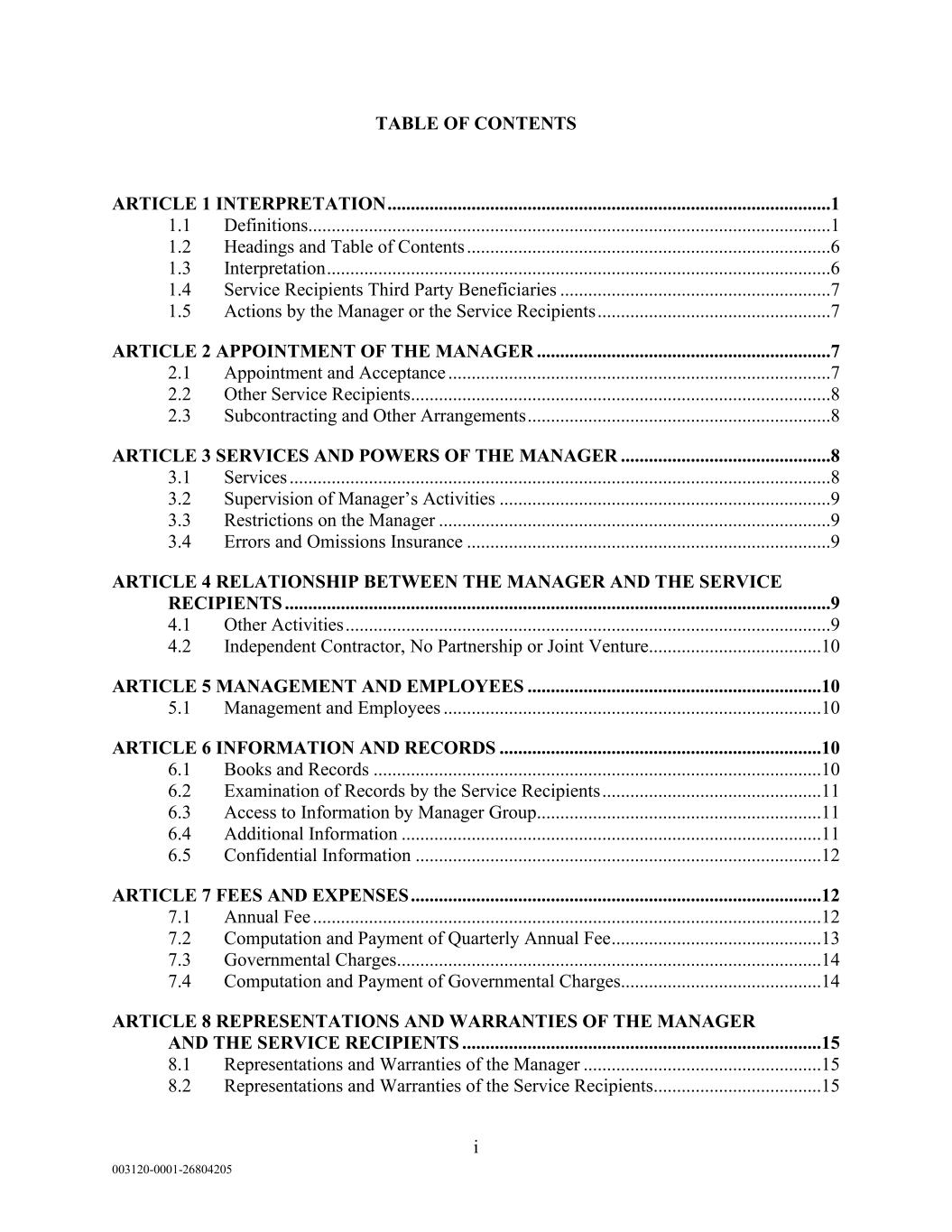 i 003120-0001-26804205 TABLE OF CONTENTS ARTICLE 1 INTERPRETATION ...............................................................................................1 1.1 Definitions................................................................................................................1 1.2 Headings and Table of Contents ..............................................................................6 1.3 Interpretation ............................................................................................................6 1.4 Service Recipients Third Party Beneficiaries ..........................................................7 1.5 Actions by the Manager or the Service Recipients ..................................................7 ARTICLE 2 APPOINTMENT OF THE MANAGER ...............................................................7 2.1 Appointment and Acceptance ..................................................................................7 2.2 Other Service Recipients..........................................................................................8 2.3 Subcontracting and Other Arrangements .................................................................8 ARTICLE 3 SERVICES AND POWERS OF THE MANAGER .............................................8 3.1 Services ....................................................................................................................8 3.2 Supervision of Manager’s Activities .......................................................................9 3.3 Restrictions on the Manager ....................................................................................9 3.4 Errors and Omissions Insurance ..............................................................................9 ARTICLE 4 RELATIONSHIP BETWEEN THE MANAGER AND THE SERVICE RECIPIENTS .....................................................................................................................9 4.1 Other Activities ........................................................................................................9 4.2 Independent Contractor, No Partnership or Joint Venture.....................................10 ARTICLE 5 MANAGEMENT AND EMPLOYEES ...............................................................10 5.1 Management and Employees .................................................................................10 ARTICLE 6 INFORMATION AND RECORDS .....................................................................10 6.1 Books and Records ................................................................................................10 6.2 Examination of Records by the Service Recipients ...............................................11 6.3 Access to Information by Manager Group.............................................................11 6.4 Additional Information ..........................................................................................11 6.5 Confidential Information .......................................................................................12 ARTICLE 7 FEES AND EXPENSES ........................................................................................12 7.1 Annual Fee .............................................................................................................12 7.2 Computation and Payment of Quarterly Annual Fee .............................................13 7.3 Governmental Charges...........................................................................................14 7.4 Computation and Payment of Governmental Charges...........................................14 ARTICLE 8 REPRESENTATIONS AND WARRANTIES OF THE MANAGER AND THE SERVICE RECIPIENTS .............................................................................15 8.1 Representations and Warranties of the Manager ...................................................15 8.2 Representations and Warranties of the Service Recipients ....................................15