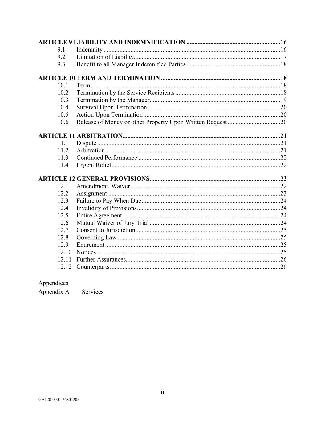 ii 003120-0001-26804205 ARTICLE 9 LIABILITY AND INDEMNIFICATION ...........................................................16 9.1 Indemnity ...............................................................................................................16 9.2 Limitation of Liability............................................................................................17 9.3 Benefit to all Manager Indemnified Parties ...........................................................18 ARTICLE 10 TERM AND TERMINATION ...........................................................................18 10.1 Term .......................................................................................................................18 10.2 Termination by the Service Recipients ..................................................................18 10.3 Termination by the Manager ..................................................................................19 10.4 Survival Upon Termination ...................................................................................20 10.5 Action Upon Termination ......................................................................................20 10.6 Release of Money or other Property Upon Written Request .................................20 ARTICLE 11 ARBITRATION ...................................................................................................21 11.1 Dispute ...................................................................................................................21 11.2 Arbitration ..............................................................................................................21 11.3 Continued Performance .........................................................................................22 11.4 Urgent Relief ..........................................................................................................22 ARTICLE 12 GENERAL PROVISIONS ..................................................................................22 12.1 Amendment, Waiver ..............................................................................................22 12.2 Assignment ............................................................................................................23 12.3 Failure to Pay When Due .......................................................................................24 12.4 Invalidity of Provisions ..........................................................................................24 12.5 Entire Agreement ...................................................................................................24 12.6 Mutual Waiver of Jury Trial ..................................................................................24 12.7 Consent to Jurisdiction ...........................................................................................25 12.8 Governing Law ......................................................................................................25 12.9 Enurement ..............................................................................................................25 12.10 Notices ...................................................................................................................25 12.11 Further Assurances.................................................................................................26 12.12 Counterparts ...........................................................................................................26 Appendices Appendix A Services