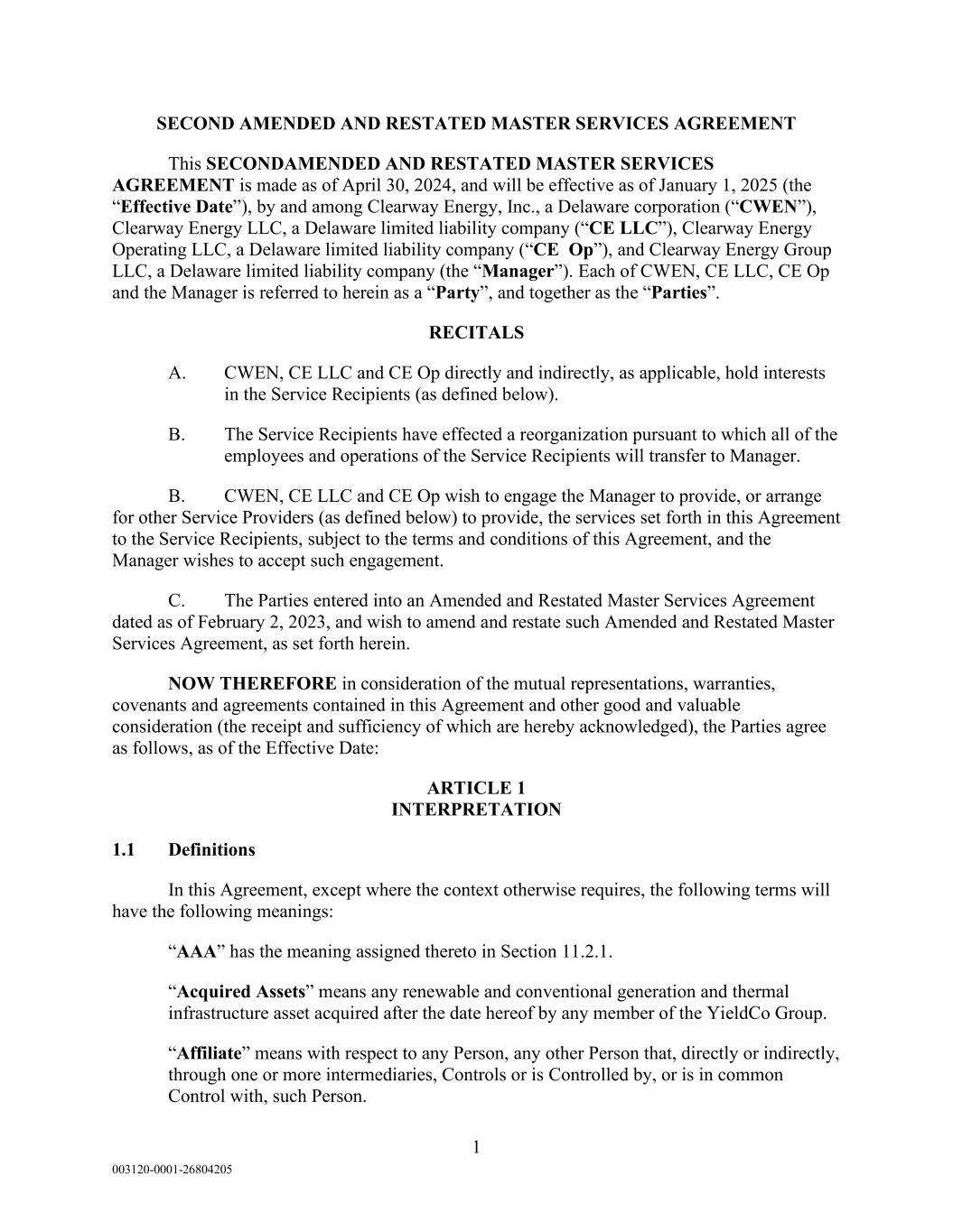 1 003120-0001-26804205 SECOND AMENDED AND RESTATED MASTER SERVICES AGREEMENT This SECONDAMENDED AND RESTATED MASTER SERVICES AGREEMENT is made as of April 30, 2024, and will be effective as of January 1, 2025 (the “Effective Date”), by and among Clearway Energy, Inc., a Delaware corporation (“CWEN”), Clearway Energy LLC, a Delaware limited liability company (“CE LLC”), Clearway Energy Operating LLC, a Delaware limited liability company (“CE Op”), and Clearway Energy Group LLC, a Delaware limited liability company (the “Manager”). Each of CWEN, CE LLC, CE Op and the Manager is referred to herein as a “Party”, and together as the “Parties”. RECITALS A. CWEN, CE LLC and CE Op directly and indirectly, as applicable, hold interests in the Service Recipients (as defined below). B. The Service Recipients have effected a reorganization pursuant to which all of the employees and operations of the Service Recipients will transfer to Manager. B. CWEN, CE LLC and CE Op wish to engage the Manager to provide, or arrange for other Service Providers (as defined below) to provide, the services set forth in this Agreement to the Service Recipients, subject to the terms and conditions of this Agreement, and the Manager wishes to accept such engagement. C. The Parties entered into an Amended and Restated Master Services Agreement dated as of February 2, 2023, and wish to amend and restate such Amended and Restated Master Services Agreement, as set forth herein. NOW THEREFORE in consideration of the mutual representations, warranties, covenants and agreements contained in this Agreement and other good and valuable consideration (the receipt and sufficiency of which are hereby acknowledged), the Parties agree as follows, as of the Effective Date: ARTICLE 1 INTERPRETATION 1.1 Definitions In this Agreement, except where the context otherwise requires, the following terms will have the following meanings: “AAA” has the meaning assigned thereto in Section 11.2.1. “Acquired Assets” means any renewable and conventional generation and thermal infrastructure asset acquired after the date hereof by any member of the YieldCo Group. “Affiliate” means with respect to any Person, any other Person that, directly or indirectly, through one or more intermediaries, Controls or is Controlled by, or is in common Control with, such Person.