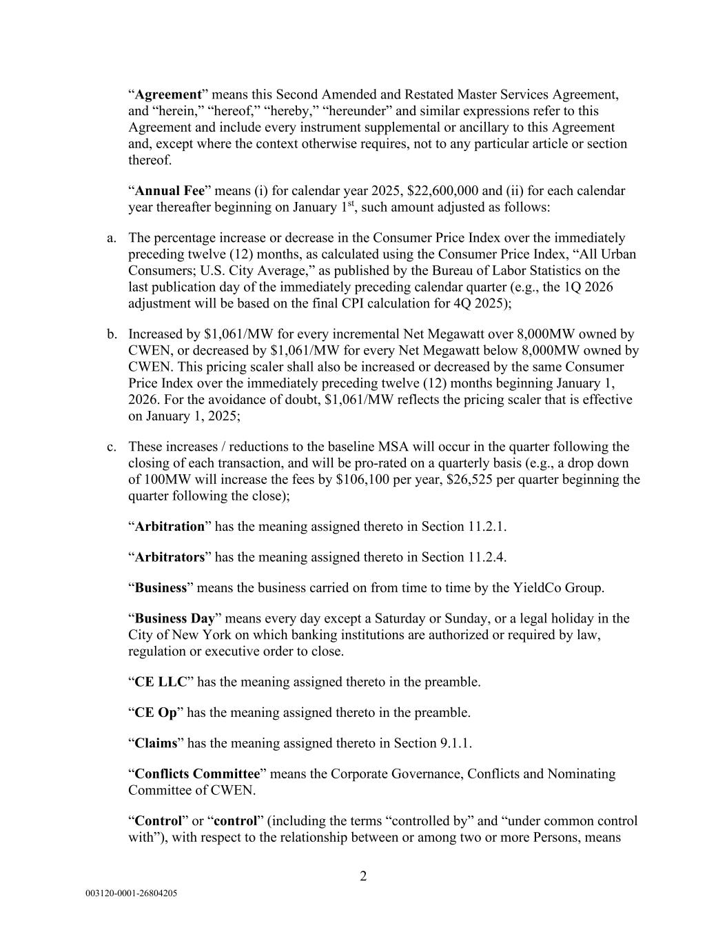 2 003120-0001-26804205 “Agreement” means this Second Amended and Restated Master Services Agreement, and “herein,” “hereof,” “hereby,” “hereunder” and similar expressions refer to this Agreement and include every instrument supplemental or ancillary to this Agreement and, except where the context otherwise requires, not to any particular article or section thereof. “Annual Fee” means (i) for calendar year 2025, $22,600,000 and (ii) for each calendar year thereafter beginning on January 1st, such amount adjusted as follows: a. The percentage increase or decrease in the Consumer Price Index over the immediately preceding twelve (12) months, as calculated using the Consumer Price Index, “All Urban Consumers; U.S. City Average,” as published by the Bureau of Labor Statistics on the last publication day of the immediately preceding calendar quarter (e.g., the 1Q 2026 adjustment will be based on the final CPI calculation for 4Q 2025); b. Increased by $1,061/MW for every incremental Net Megawatt over 8,000MW owned by CWEN, or decreased by $1,061/MW for every Net Megawatt below 8,000MW owned by CWEN. This pricing scaler shall also be increased or decreased by the same Consumer Price Index over the immediately preceding twelve (12) months beginning January 1, 2026. For the avoidance of doubt, $1,061/MW reflects the pricing scaler that is effective on January 1, 2025; c. These increases / reductions to the baseline MSA will occur in the quarter following the closing of each transaction, and will be pro-rated on a quarterly basis (e.g., a drop down of 100MW will increase the fees by $106,100 per year, $26,525 per quarter beginning the quarter following the close); “Arbitration” has the meaning assigned thereto in Section 11.2.1. “Arbitrators” has the meaning assigned thereto in Section 11.2.4. “Business” means the business carried on from time to time by the YieldCo Group. “Business Day” means every day except a Saturday or Sunday, or a legal holiday in the City of New York on which banking institutions are authorized or required by law, regulation or executive order to close. “CE LLC” has the meaning assigned thereto in the preamble. “CE Op” has the meaning assigned thereto in the preamble. “Claims” has the meaning assigned thereto in Section 9.1.1. “Conflicts Committee” means the Corporate Governance, Conflicts and Nominating Committee of CWEN. “Control” or “control” (including the terms “controlled by” and “under common control with”), with respect to the relationship between or among two or more Persons, means