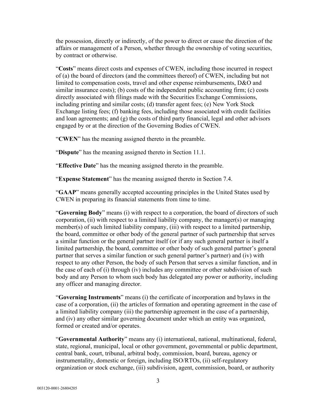 3 003120-0001-26804205 the possession, directly or indirectly, of the power to direct or cause the direction of the affairs or management of a Person, whether through the ownership of voting securities, by contract or otherwise. “Costs” means direct costs and expenses of CWEN, including those incurred in respect of (a) the board of directors (and the committees thereof) of CWEN, including but not limited to compensation costs, travel and other expense reimbursements, D&O and similar insurance costs); (b) costs of the independent public accounting firm; (c) costs directly associated with filings made with the Securities Exchange Commissions, including printing and similar costs; (d) transfer agent fees; (e) New York Stock Exchange listing fees; (f) banking fees, including those associated with credit facilities and loan agreements; and (g) the costs of third party financial, legal and other advisors engaged by or at the direction of the Governing Bodies of CWEN. “CWEN” has the meaning assigned thereto in the preamble. “Dispute” has the meaning assigned thereto in Section 11.1. “Effective Date” has the meaning assigned thereto in the preamble. “Expense Statement” has the meaning assigned thereto in Section 7.4. “GAAP” means generally accepted accounting principles in the United States used by CWEN in preparing its financial statements from time to time. “Governing Body” means (i) with respect to a corporation, the board of directors of such corporation, (ii) with respect to a limited liability company, the manager(s) or managing member(s) of such limited liability company, (iii) with respect to a limited partnership, the board, committee or other body of the general partner of such partnership that serves a similar function or the general partner itself (or if any such general partner is itself a limited partnership, the board, committee or other body of such general partner’s general partner that serves a similar function or such general partner’s partner) and (iv) with respect to any other Person, the body of such Person that serves a similar function, and in the case of each of (i) through (iv) includes any committee or other subdivision of such body and any Person to whom such body has delegated any power or authority, including any officer and managing director. “Governing Instruments” means (i) the certificate of incorporation and bylaws in the case of a corporation, (ii) the articles of formation and operating agreement in the case of a limited liability company (iii) the partnership agreement in the case of a partnership, and (iv) any other similar governing document under which an entity was organized, formed or created and/or operates. “Governmental Authority” means any (i) international, national, multinational, federal, state, regional, municipal, local or other government, governmental or public department, central bank, court, tribunal, arbitral body, commission, board, bureau, agency or instrumentality, domestic or foreign, including ISO/RTOs, (ii) self-regulatory organization or stock exchange, (iii) subdivision, agent, commission, board, or authority