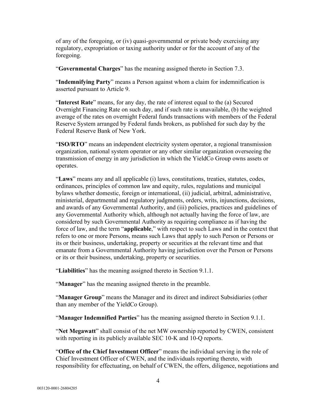 4 003120-0001-26804205 of any of the foregoing, or (iv) quasi-governmental or private body exercising any regulatory, expropriation or taxing authority under or for the account of any of the foregoing. “Governmental Charges” has the meaning assigned thereto in Section 7.3. “Indemnifying Party” means a Person against whom a claim for indemnification is asserted pursuant to Article 9. “Interest Rate” means, for any day, the rate of interest equal to the (a) Secured Overnight Financing Rate on such day, and if such rate is unavailable, (b) the weighted average of the rates on overnight Federal funds transactions with members of the Federal Reserve System arranged by Federal funds brokers, as published for such day by the Federal Reserve Bank of New York. “ISO/RTO” means an independent electricity system operator, a regional transmission organization, national system operator or any other similar organization overseeing the transmission of energy in any jurisdiction in which the YieldCo Group owns assets or operates. “Laws” means any and all applicable (i) laws, constitutions, treaties, statutes, codes, ordinances, principles of common law and equity, rules, regulations and municipal bylaws whether domestic, foreign or international, (ii) judicial, arbitral, administrative, ministerial, departmental and regulatory judgments, orders, writs, injunctions, decisions, and awards of any Governmental Authority, and (iii) policies, practices and guidelines of any Governmental Authority which, although not actually having the force of law, are considered by such Governmental Authority as requiring compliance as if having the force of law, and the term “applicable,” with respect to such Laws and in the context that refers to one or more Persons, means such Laws that apply to such Person or Persons or its or their business, undertaking, property or securities at the relevant time and that emanate from a Governmental Authority having jurisdiction over the Person or Persons or its or their business, undertaking, property or securities. “Liabilities” has the meaning assigned thereto in Section 9.1.1. “Manager” has the meaning assigned thereto in the preamble. “Manager Group” means the Manager and its direct and indirect Subsidiaries (other than any member of the YieldCo Group). “Manager Indemnified Parties” has the meaning assigned thereto in Section 9.1.1. “Net Megawatt” shall consist of the net MW ownership reported by CWEN, consistent with reporting in its publicly available SEC 10-K and 10-Q reports. “Office of the Chief Investment Officer” means the individual serving in the role of Chief Investment Officer of CWEN, and the individuals reporting thereto, with responsibility for effectuating, on behalf of CWEN, the offers, diligence, negotiations and