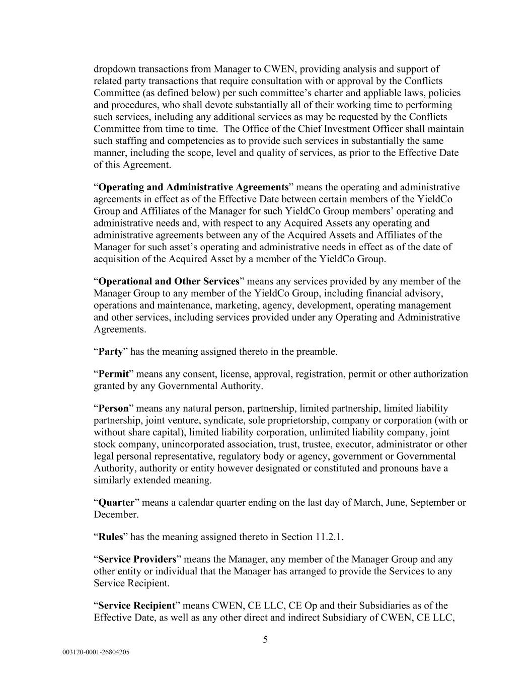 5 003120-0001-26804205 dropdown transactions from Manager to CWEN, providing analysis and support of related party transactions that require consultation with or approval by the Conflicts Committee (as defined below) per such committee’s charter and appliable laws, policies and procedures, who shall devote substantially all of their working time to performing such services, including any additional services as may be requested by the Conflicts Committee from time to time. The Office of the Chief Investment Officer shall maintain such staffing and competencies as to provide such services in substantially the same manner, including the scope, level and quality of services, as prior to the Effective Date of this Agreement. “Operating and Administrative Agreements” means the operating and administrative agreements in effect as of the Effective Date between certain members of the YieldCo Group and Affiliates of the Manager for such YieldCo Group members’ operating and administrative needs and, with respect to any Acquired Assets any operating and administrative agreements between any of the Acquired Assets and Affiliates of the Manager for such asset’s operating and administrative needs in effect as of the date of acquisition of the Acquired Asset by a member of the YieldCo Group. “Operational and Other Services” means any services provided by any member of the Manager Group to any member of the YieldCo Group, including financial advisory, operations and maintenance, marketing, agency, development, operating management and other services, including services provided under any Operating and Administrative Agreements. “Party” has the meaning assigned thereto in the preamble. “Permit” means any consent, license, approval, registration, permit or other authorization granted by any Governmental Authority. “Person” means any natural person, partnership, limited partnership, limited liability partnership, joint venture, syndicate, sole proprietorship, company or corporation (with or without share capital), limited liability corporation, unlimited liability company, joint stock company, unincorporated association, trust, trustee, executor, administrator or other legal personal representative, regulatory body or agency, government or Governmental Authority, authority or entity however designated or constituted and pronouns have a similarly extended meaning. “Quarter” means a calendar quarter ending on the last day of March, June, September or December. “Rules” has the meaning assigned thereto in Section 11.2.1. “Service Providers” means the Manager, any member of the Manager Group and any other entity or individual that the Manager has arranged to provide the Services to any Service Recipient. “Service Recipient” means CWEN, CE LLC, CE Op and their Subsidiaries as of the Effective Date, as well as any other direct and indirect Subsidiary of CWEN, CE LLC,