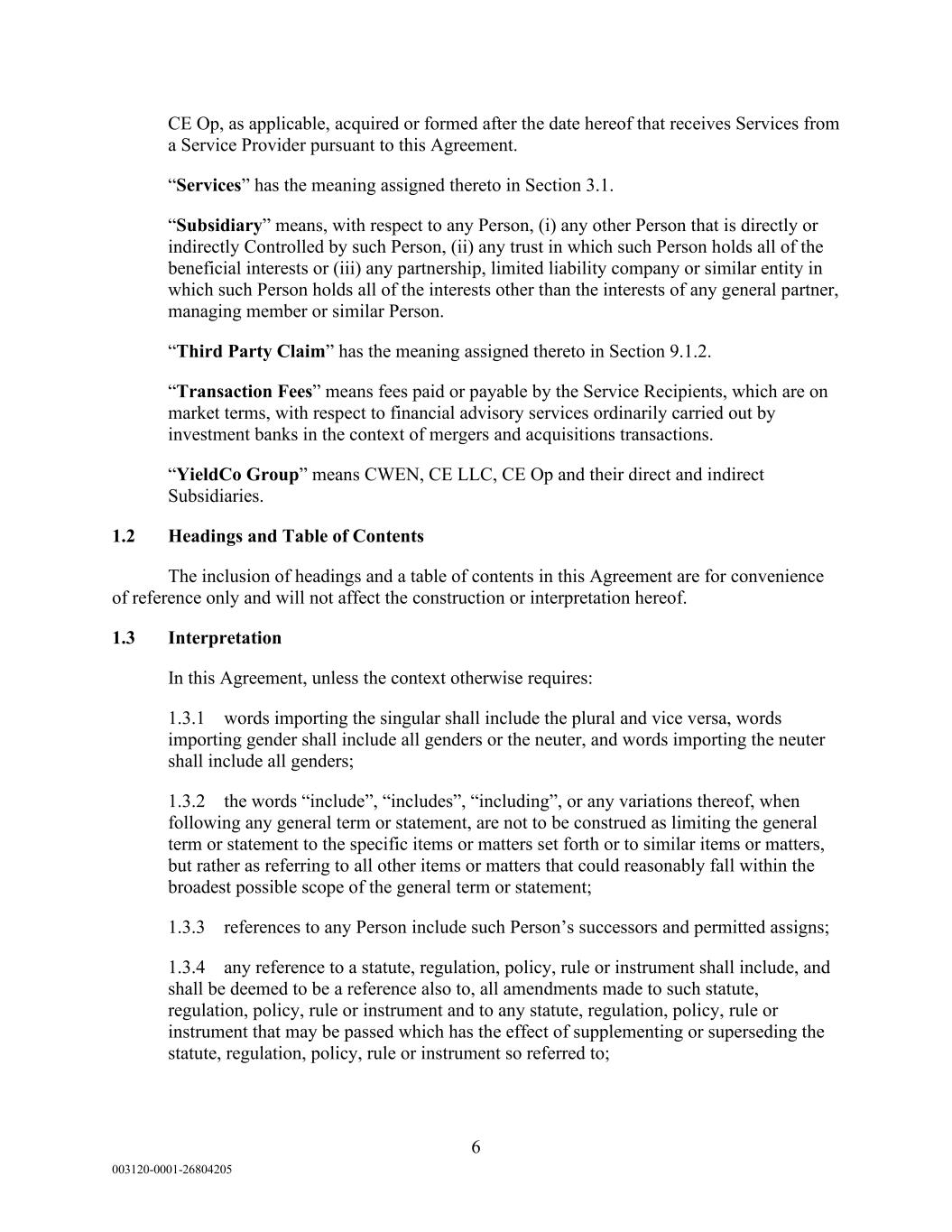 6 003120-0001-26804205 CE Op, as applicable, acquired or formed after the date hereof that receives Services from a Service Provider pursuant to this Agreement. “Services” has the meaning assigned thereto in Section 3.1. “Subsidiary” means, with respect to any Person, (i) any other Person that is directly or indirectly Controlled by such Person, (ii) any trust in which such Person holds all of the beneficial interests or (iii) any partnership, limited liability company or similar entity in which such Person holds all of the interests other than the interests of any general partner, managing member or similar Person. “Third Party Claim” has the meaning assigned thereto in Section 9.1.2. “Transaction Fees” means fees paid or payable by the Service Recipients, which are on market terms, with respect to financial advisory services ordinarily carried out by investment banks in the context of mergers and acquisitions transactions. “YieldCo Group” means CWEN, CE LLC, CE Op and their direct and indirect Subsidiaries. 1.2 Headings and Table of Contents The inclusion of headings and a table of contents in this Agreement are for convenience of reference only and will not affect the construction or interpretation hereof. 1.3 Interpretation In this Agreement, unless the context otherwise requires: 1.3.1 words importing the singular shall include the plural and vice versa, words importing gender shall include all genders or the neuter, and words importing the neuter shall include all genders; 1.3.2 the words “include”, “includes”, “including”, or any variations thereof, when following any general term or statement, are not to be construed as limiting the general term or statement to the specific items or matters set forth or to similar items or matters, but rather as referring to all other items or matters that could reasonably fall within the broadest possible scope of the general term or statement; 1.3.3 references to any Person include such Person’s successors and permitted assigns; 1.3.4 any reference to a statute, regulation, policy, rule or instrument shall include, and shall be deemed to be a reference also to, all amendments made to such statute, regulation, policy, rule or instrument and to any statute, regulation, policy, rule or instrument that may be passed which has the effect of supplementing or superseding the statute, regulation, policy, rule or instrument so referred to;