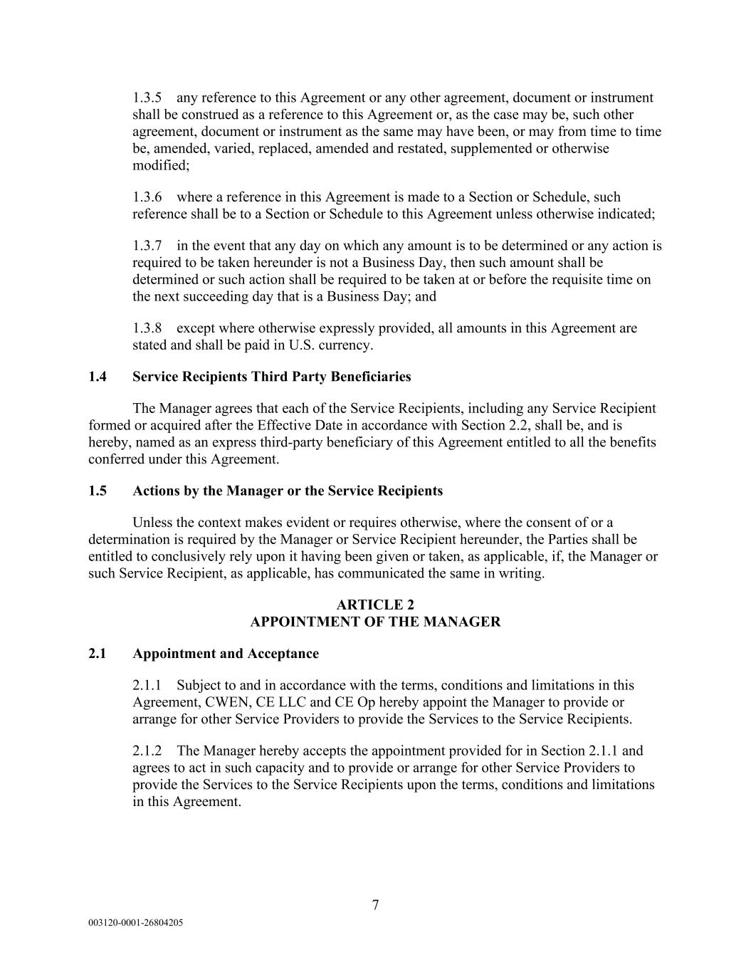 7 003120-0001-26804205 1.3.5 any reference to this Agreement or any other agreement, document or instrument shall be construed as a reference to this Agreement or, as the case may be, such other agreement, document or instrument as the same may have been, or may from time to time be, amended, varied, replaced, amended and restated, supplemented or otherwise modified; 1.3.6 where a reference in this Agreement is made to a Section or Schedule, such reference shall be to a Section or Schedule to this Agreement unless otherwise indicated; 1.3.7 in the event that any day on which any amount is to be determined or any action is required to be taken hereunder is not a Business Day, then such amount shall be determined or such action shall be required to be taken at or before the requisite time on the next succeeding day that is a Business Day; and 1.3.8 except where otherwise expressly provided, all amounts in this Agreement are stated and shall be paid in U.S. currency. 1.4 Service Recipients Third Party Beneficiaries The Manager agrees that each of the Service Recipients, including any Service Recipient formed or acquired after the Effective Date in accordance with Section 2.2, shall be, and is hereby, named as an express third-party beneficiary of this Agreement entitled to all the benefits conferred under this Agreement. 1.5 Actions by the Manager or the Service Recipients Unless the context makes evident or requires otherwise, where the consent of or a determination is required by the Manager or Service Recipient hereunder, the Parties shall be entitled to conclusively rely upon it having been given or taken, as applicable, if, the Manager or such Service Recipient, as applicable, has communicated the same in writing. ARTICLE 2 APPOINTMENT OF THE MANAGER 2.1 Appointment and Acceptance 2.1.1 Subject to and in accordance with the terms, conditions and limitations in this Agreement, CWEN, CE LLC and CE Op hereby appoint the Manager to provide or arrange for other Service Providers to provide the Services to the Service Recipients. 2.1.2 The Manager hereby accepts the appointment provided for in Section 2.1.1 and agrees to act in such capacity and to provide or arrange for other Service Providers to provide the Services to the Service Recipients upon the terms, conditions and limitations in this Agreement.