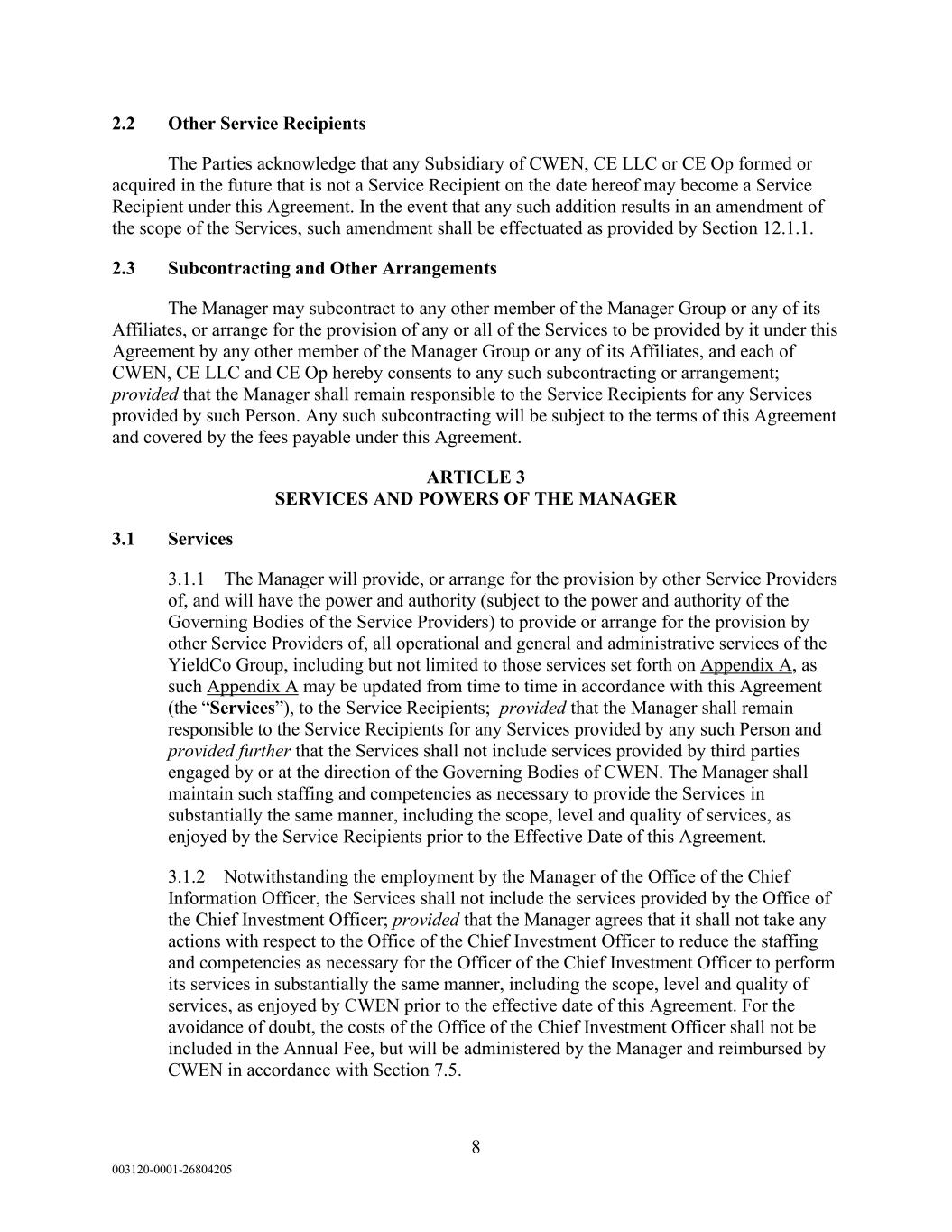 8 003120-0001-26804205 2.2 Other Service Recipients The Parties acknowledge that any Subsidiary of CWEN, CE LLC or CE Op formed or acquired in the future that is not a Service Recipient on the date hereof may become a Service Recipient under this Agreement. In the event that any such addition results in an amendment of the scope of the Services, such amendment shall be effectuated as provided by Section 12.1.1. 2.3 Subcontracting and Other Arrangements The Manager may subcontract to any other member of the Manager Group or any of its Affiliates, or arrange for the provision of any or all of the Services to be provided by it under this Agreement by any other member of the Manager Group or any of its Affiliates, and each of CWEN, CE LLC and CE Op hereby consents to any such subcontracting or arrangement; provided that the Manager shall remain responsible to the Service Recipients for any Services provided by such Person. Any such subcontracting will be subject to the terms of this Agreement and covered by the fees payable under this Agreement. ARTICLE 3 SERVICES AND POWERS OF THE MANAGER 3.1 Services 3.1.1 The Manager will provide, or arrange for the provision by other Service Providers of, and will have the power and authority (subject to the power and authority of the Governing Bodies of the Service Providers) to provide or arrange for the provision by other Service Providers of, all operational and general and administrative services of the YieldCo Group, including but not limited to those services set forth on Appendix A, as such Appendix A may be updated from time to time in accordance with this Agreement (the “Services”), to the Service Recipients; provided that the Manager shall remain responsible to the Service Recipients for any Services provided by any such Person and provided further that the Services shall not include services provided by third parties engaged by or at the direction of the Governing Bodies of CWEN. The Manager shall maintain such staffing and competencies as necessary to provide the Services in substantially the same manner, including the scope, level and quality of services, as enjoyed by the Service Recipients prior to the Effective Date of this Agreement. 3.1.2 Notwithstanding the employment by the Manager of the Office of the Chief Information Officer, the Services shall not include the services provided by the Office of the Chief Investment Officer; provided that the Manager agrees that it shall not take any actions with respect to the Office of the Chief Investment Officer to reduce the staffing and competencies as necessary for the Officer of the Chief Investment Officer to perform its services in substantially the same manner, including the scope, level and quality of services, as enjoyed by CWEN prior to the effective date of this Agreement. For the avoidance of doubt, the costs of the Office of the Chief Investment Officer shall not be included in the Annual Fee, but will be administered by the Manager and reimbursed by CWEN in accordance with Section 7.5.