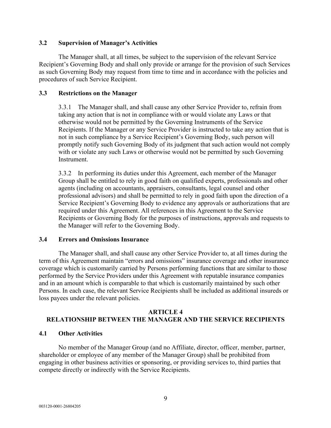 9 003120-0001-26804205 3.2 Supervision of Manager’s Activities The Manager shall, at all times, be subject to the supervision of the relevant Service Recipient’s Governing Body and shall only provide or arrange for the provision of such Services as such Governing Body may request from time to time and in accordance with the policies and procedures of such Service Recipient. 3.3 Restrictions on the Manager 3.3.1 The Manager shall, and shall cause any other Service Provider to, refrain from taking any action that is not in compliance with or would violate any Laws or that otherwise would not be permitted by the Governing Instruments of the Service Recipients. If the Manager or any Service Provider is instructed to take any action that is not in such compliance by a Service Recipient’s Governing Body, such person will promptly notify such Governing Body of its judgment that such action would not comply with or violate any such Laws or otherwise would not be permitted by such Governing Instrument. 3.3.2 In performing its duties under this Agreement, each member of the Manager Group shall be entitled to rely in good faith on qualified experts, professionals and other agents (including on accountants, appraisers, consultants, legal counsel and other professional advisors) and shall be permitted to rely in good faith upon the direction of a Service Recipient’s Governing Body to evidence any approvals or authorizations that are required under this Agreement. All references in this Agreement to the Service Recipients or Governing Body for the purposes of instructions, approvals and requests to the Manager will refer to the Governing Body. 3.4 Errors and Omissions Insurance The Manager shall, and shall cause any other Service Provider to, at all times during the term of this Agreement maintain “errors and omissions” insurance coverage and other insurance coverage which is customarily carried by Persons performing functions that are similar to those performed by the Service Providers under this Agreement with reputable insurance companies and in an amount which is comparable to that which is customarily maintained by such other Persons. In each case, the relevant Service Recipients shall be included as additional insureds or loss payees under the relevant policies. ARTICLE 4 RELATIONSHIP BETWEEN THE MANAGER AND THE SERVICE RECIPIENTS 4.1 Other Activities No member of the Manager Group (and no Affiliate, director, officer, member, partner, shareholder or employee of any member of the Manager Group) shall be prohibited from engaging in other business activities or sponsoring, or providing services to, third parties that compete directly or indirectly with the Service Recipients.