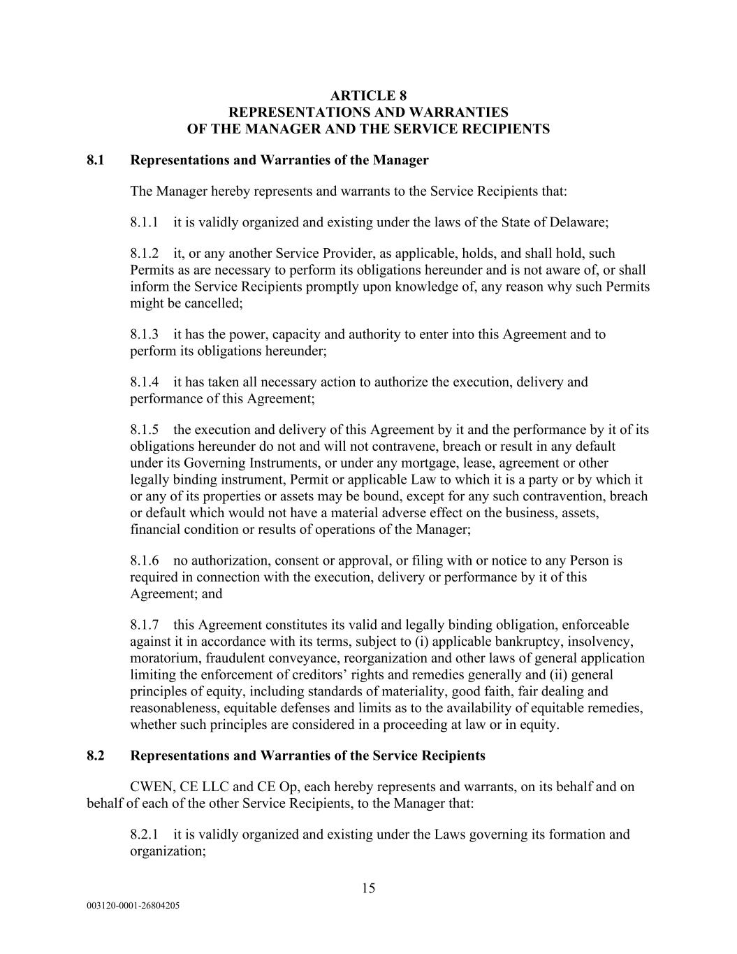 15 003120-0001-26804205 ARTICLE 8 REPRESENTATIONS AND WARRANTIES OF THE MANAGER AND THE SERVICE RECIPIENTS 8.1 Representations and Warranties of the Manager The Manager hereby represents and warrants to the Service Recipients that: 8.1.1 it is validly organized and existing under the laws of the State of Delaware; 8.1.2 it, or any another Service Provider, as applicable, holds, and shall hold, such Permits as are necessary to perform its obligations hereunder and is not aware of, or shall inform the Service Recipients promptly upon knowledge of, any reason why such Permits might be cancelled; 8.1.3 it has the power, capacity and authority to enter into this Agreement and to perform its obligations hereunder; 8.1.4 it has taken all necessary action to authorize the execution, delivery and performance of this Agreement; 8.1.5 the execution and delivery of this Agreement by it and the performance by it of its obligations hereunder do not and will not contravene, breach or result in any default under its Governing Instruments, or under any mortgage, lease, agreement or other legally binding instrument, Permit or applicable Law to which it is a party or by which it or any of its properties or assets may be bound, except for any such contravention, breach or default which would not have a material adverse effect on the business, assets, financial condition or results of operations of the Manager; 8.1.6 no authorization, consent or approval, or filing with or notice to any Person is required in connection with the execution, delivery or performance by it of this Agreement; and 8.1.7 this Agreement constitutes its valid and legally binding obligation, enforceable against it in accordance with its terms, subject to (i) applicable bankruptcy, insolvency, moratorium, fraudulent conveyance, reorganization and other laws of general application limiting the enforcement of creditors’ rights and remedies generally and (ii) general principles of equity, including standards of materiality, good faith, fair dealing and reasonableness, equitable defenses and limits as to the availability of equitable remedies, whether such principles are considered in a proceeding at law or in equity. 8.2 Representations and Warranties of the Service Recipients CWEN, CE LLC and CE Op, each hereby represents and warrants, on its behalf and on behalf of each of the other Service Recipients, to the Manager that: 8.2.1 it is validly organized and existing under the Laws governing its formation and organization;