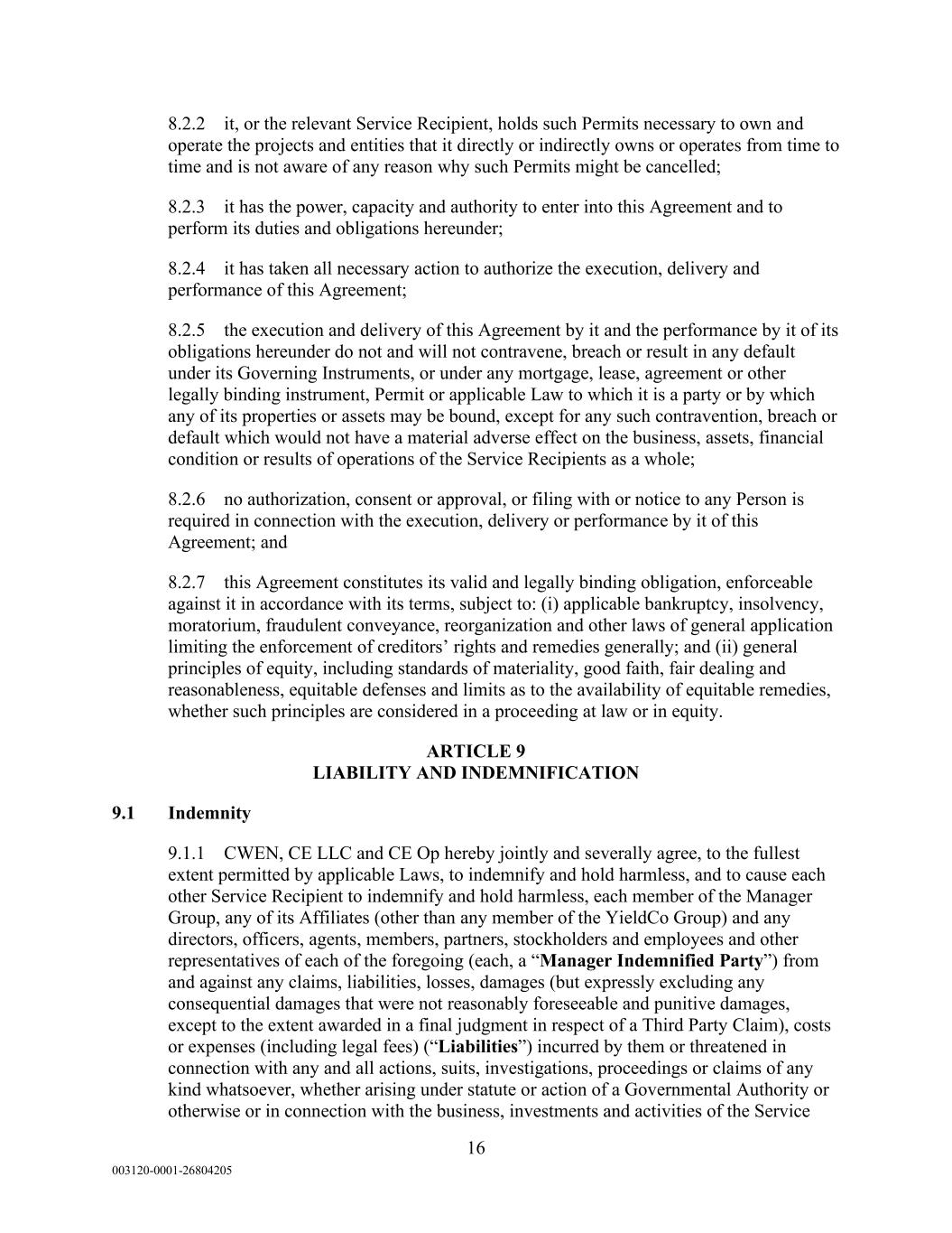 16 003120-0001-26804205 8.2.2 it, or the relevant Service Recipient, holds such Permits necessary to own and operate the projects and entities that it directly or indirectly owns or operates from time to time and is not aware of any reason why such Permits might be cancelled; 8.2.3 it has the power, capacity and authority to enter into this Agreement and to perform its duties and obligations hereunder; 8.2.4 it has taken all necessary action to authorize the execution, delivery and performance of this Agreement; 8.2.5 the execution and delivery of this Agreement by it and the performance by it of its obligations hereunder do not and will not contravene, breach or result in any default under its Governing Instruments, or under any mortgage, lease, agreement or other legally binding instrument, Permit or applicable Law to which it is a party or by which any of its properties or assets may be bound, except for any such contravention, breach or default which would not have a material adverse effect on the business, assets, financial condition or results of operations of the Service Recipients as a whole; 8.2.6 no authorization, consent or approval, or filing with or notice to any Person is required in connection with the execution, delivery or performance by it of this Agreement; and 8.2.7 this Agreement constitutes its valid and legally binding obligation, enforceable against it in accordance with its terms, subject to: (i) applicable bankruptcy, insolvency, moratorium, fraudulent conveyance, reorganization and other laws of general application limiting the enforcement of creditors’ rights and remedies generally; and (ii) general principles of equity, including standards of materiality, good faith, fair dealing and reasonableness, equitable defenses and limits as to the availability of equitable remedies, whether such principles are considered in a proceeding at law or in equity. ARTICLE 9 LIABILITY AND INDEMNIFICATION 9.1 Indemnity 9.1.1 CWEN, CE LLC and CE Op hereby jointly and severally agree, to the fullest extent permitted by applicable Laws, to indemnify and hold harmless, and to cause each other Service Recipient to indemnify and hold harmless, each member of the Manager Group, any of its Affiliates (other than any member of the YieldCo Group) and any directors, officers, agents, members, partners, stockholders and employees and other representatives of each of the foregoing (each, a “Manager Indemnified Party”) from and against any claims, liabilities, losses, damages (but expressly excluding any consequential damages that were not reasonably foreseeable and punitive damages, except to the extent awarded in a final judgment in respect of a Third Party Claim), costs or expenses (including legal fees) (“Liabilities”) incurred by them or threatened in connection with any and all actions, suits, investigations, proceedings or claims of any kind whatsoever, whether arising under statute or action of a Governmental Authority or otherwise or in connection with the business, investments and activities of the Service
