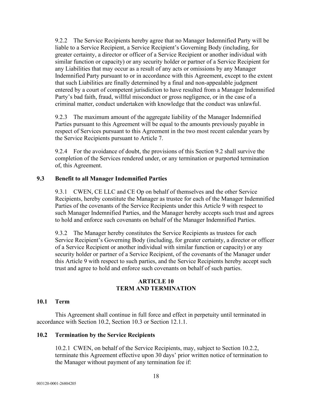 18 003120-0001-26804205 9.2.2 The Service Recipients hereby agree that no Manager Indemnified Party will be liable to a Service Recipient, a Service Recipient’s Governing Body (including, for greater certainty, a director or officer of a Service Recipient or another individual with similar function or capacity) or any security holder or partner of a Service Recipient for any Liabilities that may occur as a result of any acts or omissions by any Manager Indemnified Party pursuant to or in accordance with this Agreement, except to the extent that such Liabilities are finally determined by a final and non-appealable judgment entered by a court of competent jurisdiction to have resulted from a Manager Indemnified Party’s bad faith, fraud, willful misconduct or gross negligence, or in the case of a criminal matter, conduct undertaken with knowledge that the conduct was unlawful. 9.2.3 The maximum amount of the aggregate liability of the Manager Indemnified Parties pursuant to this Agreement will be equal to the amounts previously payable in respect of Services pursuant to this Agreement in the two most recent calendar years by the Service Recipients pursuant to Article 7. 9.2.4 For the avoidance of doubt, the provisions of this Section 9.2 shall survive the completion of the Services rendered under, or any termination or purported termination of, this Agreement. 9.3 Benefit to all Manager Indemnified Parties 9.3.1 CWEN, CE LLC and CE Op on behalf of themselves and the other Service Recipients, hereby constitute the Manager as trustee for each of the Manager Indemnified Parties of the covenants of the Service Recipients under this Article 9 with respect to such Manager Indemnified Parties, and the Manager hereby accepts such trust and agrees to hold and enforce such covenants on behalf of the Manager Indemnified Parties. 9.3.2 The Manager hereby constitutes the Service Recipients as trustees for each Service Recipient’s Governing Body (including, for greater certainty, a director or officer of a Service Recipient or another individual with similar function or capacity) or any security holder or partner of a Service Recipient, of the covenants of the Manager under this Article 9 with respect to such parties, and the Service Recipients hereby accept such trust and agree to hold and enforce such covenants on behalf of such parties. ARTICLE 10 TERM AND TERMINATION 10.1 Term This Agreement shall continue in full force and effect in perpetuity until terminated in accordance with Section 10.2, Section 10.3 or Section 12.1.1. 10.2 Termination by the Service Recipients 10.2.1 CWEN, on behalf of the Service Recipients, may, subject to Section 10.2.2, terminate this Agreement effective upon 30 days’ prior written notice of termination to the Manager without payment of any termination fee if: