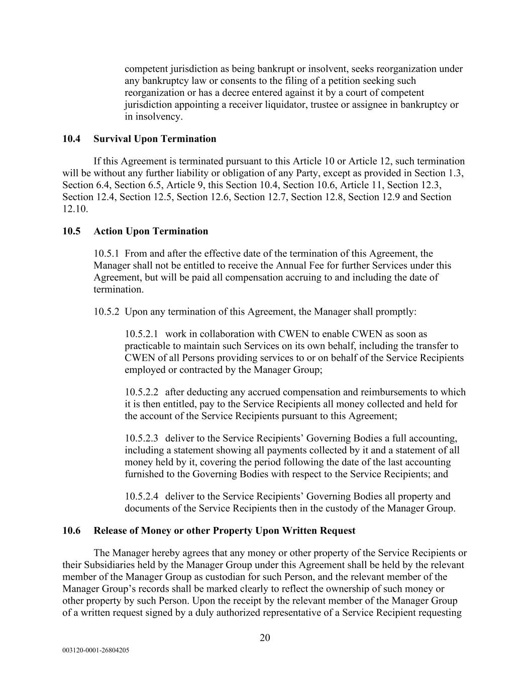 20 003120-0001-26804205 competent jurisdiction as being bankrupt or insolvent, seeks reorganization under any bankruptcy law or consents to the filing of a petition seeking such reorganization or has a decree entered against it by a court of competent jurisdiction appointing a receiver liquidator, trustee or assignee in bankruptcy or in insolvency. 10.4 Survival Upon Termination If this Agreement is terminated pursuant to this Article 10 or Article 12, such termination will be without any further liability or obligation of any Party, except as provided in Section 1.3, Section 6.4, Section 6.5, Article 9, this Section 10.4, Section 10.6, Article 11, Section 12.3, Section 12.4, Section 12.5, Section 12.6, Section 12.7, Section 12.8, Section 12.9 and Section 12.10. 10.5 Action Upon Termination 10.5.1 From and after the effective date of the termination of this Agreement, the Manager shall not be entitled to receive the Annual Fee for further Services under this Agreement, but will be paid all compensation accruing to and including the date of termination. 10.5.2 Upon any termination of this Agreement, the Manager shall promptly: 10.5.2.1 work in collaboration with CWEN to enable CWEN as soon as practicable to maintain such Services on its own behalf, including the transfer to CWEN of all Persons providing services to or on behalf of the Service Recipients employed or contracted by the Manager Group; 10.5.2.2 after deducting any accrued compensation and reimbursements to which it is then entitled, pay to the Service Recipients all money collected and held for the account of the Service Recipients pursuant to this Agreement; 10.5.2.3 deliver to the Service Recipients’ Governing Bodies a full accounting, including a statement showing all payments collected by it and a statement of all money held by it, covering the period following the date of the last accounting furnished to the Governing Bodies with respect to the Service Recipients; and 10.5.2.4 deliver to the Service Recipients’ Governing Bodies all property and documents of the Service Recipients then in the custody of the Manager Group. 10.6 Release of Money or other Property Upon Written Request The Manager hereby agrees that any money or other property of the Service Recipients or their Subsidiaries held by the Manager Group under this Agreement shall be held by the relevant member of the Manager Group as custodian for such Person, and the relevant member of the Manager Group’s records shall be marked clearly to reflect the ownership of such money or other property by such Person. Upon the receipt by the relevant member of the Manager Group of a written request signed by a duly authorized representative of a Service Recipient requesting