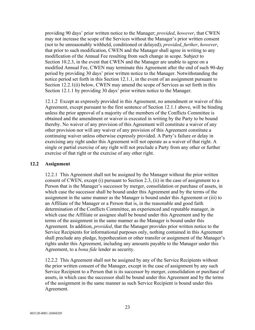 23 003120-0001-26804205 providing 90 days’ prior written notice to the Manager; provided, however, that CWEN may not increase the scope of the Services without the Manager’s prior written consent (not to be unreasonably withheld, conditioned or delayed); provided, further, however, that prior to such modification, CWEN and the Manager shall agree in writing to any modification of the Annual Fee resulting from such change in scope. Subject to Section 10.2.3, in the event that CWEN and the Manager are unable to agree on a modified Annual Fee, CWEN may terminate this Agreement after the end of such 90-day period by providing 30 days’ prior written notice to the Manager. Notwithstanding the notice period set forth in this Section 12.1.1, in the event of an assignment pursuant to Section 12.2.1(ii) below, CWEN may amend the scope of Services as set forth in this Section 12.1.1 by providing 30 days’ prior written notice to the Manager. 12.1.2 Except as expressly provided in this Agreement, no amendment or waiver of this Agreement, except pursuant to the first sentence of Section 12.1.1 above, will be binding unless the prior approval of a majority of the members of the Conflicts Committee is obtained and the amendment or waiver is executed in writing by the Party to be bound thereby. No waiver of any provision of this Agreement will constitute a waiver of any other provision nor will any waiver of any provision of this Agreement constitute a continuing waiver unless otherwise expressly provided. A Party’s failure or delay in exercising any right under this Agreement will not operate as a waiver of that right. A single or partial exercise of any right will not preclude a Party from any other or further exercise of that right or the exercise of any other right. 12.2 Assignment 12.2.1 This Agreement shall not be assigned by the Manager without the prior written consent of CWEN, except (i) pursuant to Section 2.3, (ii) in the case of assignment to a Person that is the Manager’s successor by merger, consolidation or purchase of assets, in which case the successor shall be bound under this Agreement and by the terms of the assignment in the same manner as the Manager is bound under this Agreement or (iii) to an Affiliate of the Manager or a Person that is, in the reasonable and good faith determination of the Conflicts Committee, an experienced and reputable manager, in which case the Affiliate or assignee shall be bound under this Agreement and by the terms of the assignment in the same manner as the Manager is bound under this Agreement. In addition, provided, that the Manager provides prior written notice to the Service Recipients for informational purposes only, nothing contained in this Agreement shall preclude any pledge, hypothecation or other transfer or assignment of the Manager’s rights under this Agreement, including any amounts payable to the Manager under this Agreement, to a bona fide lender as security. 12.2.2 This Agreement shall not be assigned by any of the Service Recipients without the prior written consent of the Manager, except in the case of assignment by any such Service Recipient to a Person that is its successor by merger, consolidation or purchase of assets, in which case the successor shall be bound under this Agreement and by the terms of the assignment in the same manner as such Service Recipient is bound under this Agreement.