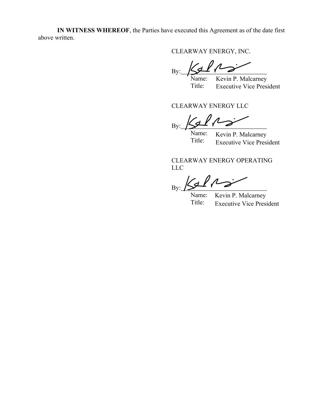 IN WITNESS WHEREOF, the Parties have executed this Agreement as of the date first above written. CLEARWAY ENERGY, INC. By: Name: Title: CLEARWAY ENERGY LLC By: Name: Title: CLEARWAY ENERGY OPERATING LLC By: Name: Title: Kevin P. Malcarney Executive Vice President Kevin P. Malcarney Executive Vice President Kevin P. Malcarney Executive Vice President
