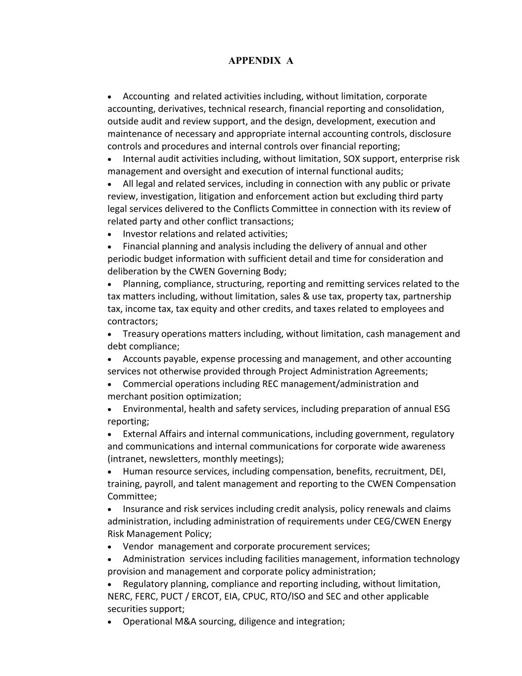 APPENDIX A • Accounting and related activities including, without limitation, corporate accounting, derivatives, technical research, financial reporting and consolidation, outside audit and review support, and the design, development, execution and maintenance of necessary and appropriate internal accounting controls, disclosure controls and procedures and internal controls over financial reporting; • Internal audit activities including, without limitation, SOX support, enterprise risk management and oversight and execution of internal functional audits; • All legal and related services, including in connection with any public or private review, investigation, litigation and enforcement action but excluding third party legal services delivered to the Conflicts Committee in connection with its review of related party and other conflict transactions; • Investor relations and related activities; • Financial planning and analysis including the delivery of annual and other periodic budget information with sufficient detail and time for consideration and deliberation by the CWEN Governing Body; • Planning, compliance, structuring, reporting and remitting services related to the tax matters including, without limitation, sales & use tax, property tax, partnership tax, income tax, tax equity and other credits, and taxes related to employees and contractors; • Treasury operations matters including, without limitation, cash management and debt compliance; • Accounts payable, expense processing and management, and other accounting services not otherwise provided through Project Administration Agreements; • Commercial operations including REC management/administration and merchant position optimization; • Environmental, health and safety services, including preparation of annual ESG reporting; • External Affairs and internal communications, including government, regulatory and communications and internal communications for corporate wide awareness (intranet, newsletters, monthly meetings); • Human resource services, including compensation, benefits, recruitment, DEI, training, payroll, and talent management and reporting to the CWEN Compensation Committee; • Insurance and risk services including credit analysis, policy renewals and claims administration, including administration of requirements under CEG/CWEN Energy Risk Management Policy; • Vendor management and corporate procurement services; • Administration services including facilities management, information technology provision and management and corporate policy administration; • Regulatory planning, compliance and reporting including, without limitation, NERC, FERC, PUCT / ERCOT, EIA, CPUC, RTO/ISO and SEC and other applicable securities support; • Operational M&A sourcing, diligence and integration;