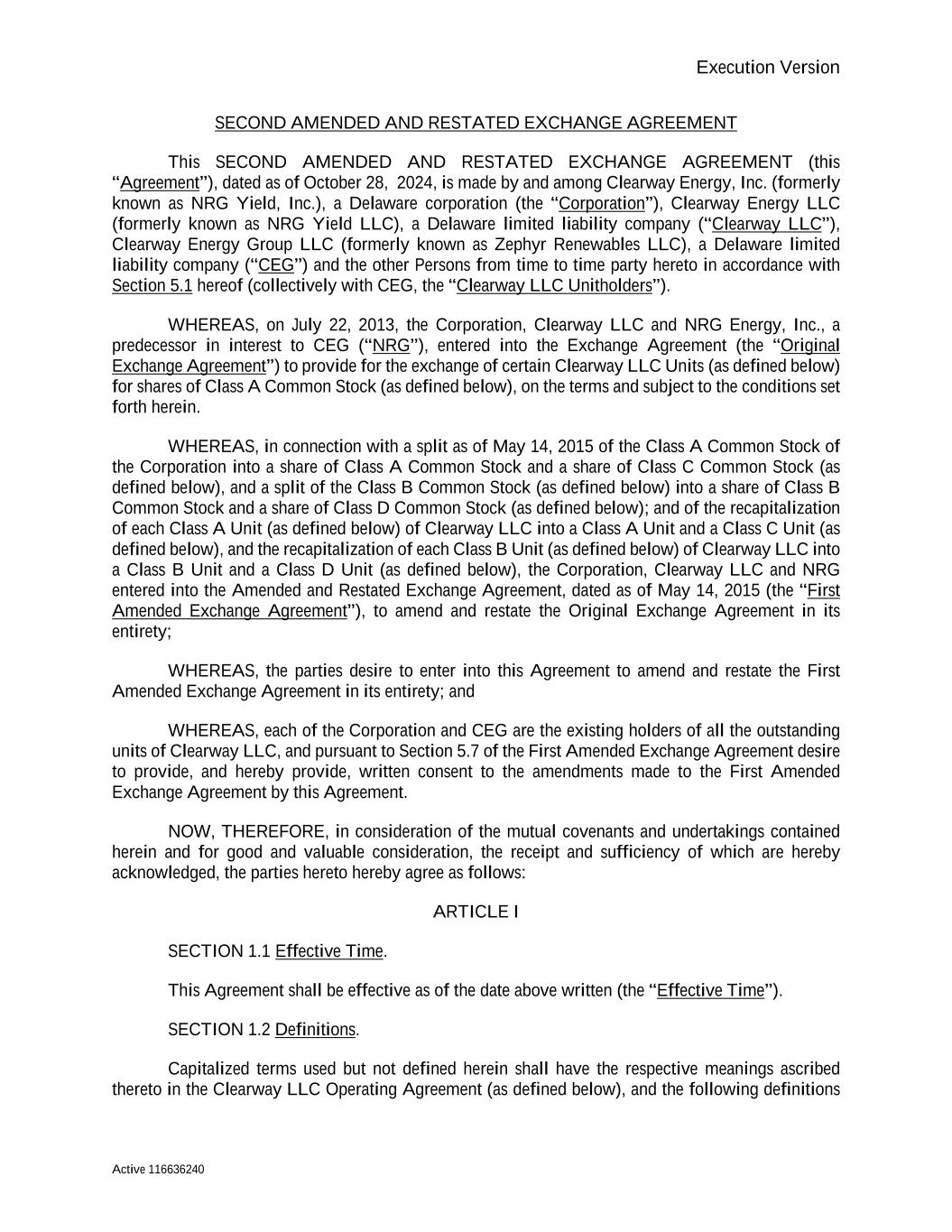 Execution Version Active 116636240 SECOND AMENDED AND RESTATED EXCHANGE AGREEMENT This SECOND AMENDED AND RESTATED EXCHANGE AGREEMENT (this “Agreement”), dated as of October 28, 2024, is made by and among Clearway Energy, Inc. (formerly known as NRG Yield, Inc.), a Delaware corporation (the “Corporation”), Clearway Energy LLC (formerly known as NRG Yield LLC), a Delaware limited liability company (“Clearway LLC”), Clearway Energy Group LLC (formerly known as Zephyr Renewables LLC), a Delaware limited liability company (“CEG”) and the other Persons from time to time party hereto in accordance with Section 5.1 hereof (collectively with CEG, the “Clearway LLC Unitholders”). WHEREAS, on July 22, 2013, the Corporation, Clearway LLC and NRG Energy, Inc., a predecessor in interest to CEG (“NRG”), entered into the Exchange Agreement (the “Original Exchange Agreement”) to provide for the exchange of certain Clearway LLC Units (as defined below) for shares of Class A Common Stock (as defined below), on the terms and subject to the conditions set forth herein. WHEREAS, in connection with a split as of May 14, 2015 of the Class A Common Stock of the Corporation into a share of Class A Common Stock and a share of Class C Common Stock (as defined below), and a split of the Class B Common Stock (as defined below) into a share of Class B Common Stock and a share of Class D Common Stock (as defined below); and of the recapitalization of each Class A Unit (as defined below) of Clearway LLC into a Class A Unit and a Class C Unit (as defined below), and the recapitalization of each Class B Unit (as defined below) of Clearway LLC into a Class B Unit and a Class D Unit (as defined below), the Corporation, Clearway LLC and NRG entered into the Amended and Restated Exchange Agreement, dated as of May 14, 2015 (the “First Amended Exchange Agreement”), to amend and restate the Original Exchange Agreement in its entirety; WHEREAS, the parties desire to enter into this Agreement to amend and restate the First Amended Exchange Agreement in its entirety; and WHEREAS, each of the Corporation and CEG are the existing holders of all the outstanding units of Clearway LLC, and pursuant to Section 5.7 of the First Amended Exchange Agreement desire to provide, and hereby provide, written consent to the amendments made to the First Amended Exchange Agreement by this Agreement. NOW, THEREFORE, in consideration of the mutual covenants and undertakings contained herein and for good and valuable consideration, the receipt and sufficiency of which are hereby acknowledged, the parties hereto hereby agree as follows: ARTICLE I SECTION 1.1 Effective Time. This Agreement shall be effective as of the date above written (the “Effective Time”). SECTION 1.2 Definitions. Capitalized terms used but not defined herein shall have the respective meanings ascribed thereto in the Clearway LLC Operating Agreement (as defined below), and the following definitions