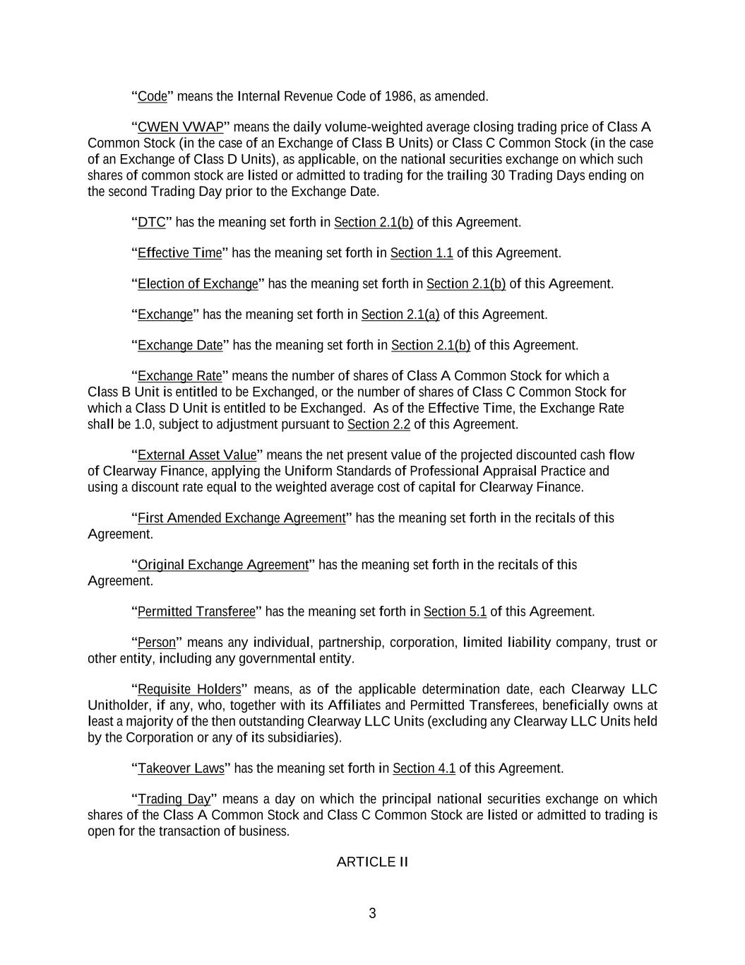 3 “Code” means the Internal Revenue Code of 1986, as amended. “CWEN VWAP” means the daily volume-weighted average closing trading price of Class A Common Stock (in the case of an Exchange of Class B Units) or Class C Common Stock (in the case of an Exchange of Class D Units), as applicable, on the national securities exchange on which such shares of common stock are listed or admitted to trading for the trailing 30 Trading Days ending on the second Trading Day prior to the Exchange Date. “DTC” has the meaning set forth in Section 2.1(b) of this Agreement. “Effective Time” has the meaning set forth in Section 1.1 of this Agreement. “Election of Exchange” has the meaning set forth in Section 2.1(b) of this Agreement. “Exchange” has the meaning set forth in Section 2.1(a) of this Agreement. “Exchange Date” has the meaning set forth in Section 2.1(b) of this Agreement. “Exchange Rate” means the number of shares of Class A Common Stock for which a Class B Unit is entitled to be Exchanged, or the number of shares of Class C Common Stock for which a Class D Unit is entitled to be Exchanged. As of the Effective Time, the Exchange Rate shall be 1.0, subject to adjustment pursuant to Section 2.2 of this Agreement. “External Asset Value” means the net present value of the projected discounted cash flow of Clearway Finance, applying the Uniform Standards of Professional Appraisal Practice and using a discount rate equal to the weighted average cost of capital for Clearway Finance. “First Amended Exchange Agreement” has the meaning set forth in the recitals of this Agreement. “Original Exchange Agreement” has the meaning set forth in the recitals of this Agreement. “Permitted Transferee” has the meaning set forth in Section 5.1 of this Agreement. “Person” means any individual, partnership, corporation, limited liability company, trust or other entity, including any governmental entity. “Requisite Holders” means, as of the applicable determination date, each Clearway LLC Unitholder, if any, who, together with its Affiliates and Permitted Transferees, beneficially owns at least a majority of the then outstanding Clearway LLC Units (excluding any Clearway LLC Units held by the Corporation or any of its subsidiaries). “Takeover Laws” has the meaning set forth in Section 4.1 of this Agreement. “Trading Day” means a day on which the principal national securities exchange on which shares of the Class A Common Stock and Class C Common Stock are listed or admitted to trading is open for the transaction of business. ARTICLE II