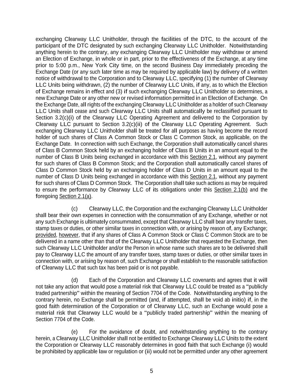 5 exchanging Clearway LLC Unitholder, through the facilities of the DTC, to the account of the participant of the DTC designated by such exchanging Clearway LLC Unitholder. Notwithstanding anything herein to the contrary, any exchanging Clearway LLC Unitholder may withdraw or amend an Election of Exchange, in whole or in part, prior to the effectiveness of the Exchange, at any time prior to 5:00 p.m., New York City time, on the second Business Day immediately preceding the Exchange Date (or any such later time as may be required by applicable law) by delivery of a written notice of withdrawal to the Corporation and to Clearway LLC, specifying (1) the number of Clearway LLC Units being withdrawn, (2) the number of Clearway LLC Units, if any, as to which the Election of Exchange remains in effect and (3) if such exchanging Clearway LLC Unitholder so determines, a new Exchange Date or any other new or revised information permitted in an Election of Exchange. On the Exchange Date, all rights of the exchanging Clearway LLC Unitholder as a holder of such Clearway LLC Units shall cease and such Clearway LLC Units shall automatically be reclassified pursuant to Section 3.2(c)(i) of the Clearway LLC Operating Agreement and delivered to the Corporation by Clearway LLC pursuant to Section 3.2(c)(ii) of the Clearway LLC Operating Agreement. Such exchanging Clearway LLC Unitholder shall be treated for all purposes as having become the record holder of such shares of Class A Common Stock or Class C Common Stock, as applicable, on the Exchange Date. In connection with such Exchange, the Corporation shall automatically cancel shares of Class B Common Stock held by an exchanging holder of Class B Units in an amount equal to the number of Class B Units being exchanged in accordance with this Section 2.1, without any payment for such shares of Class B Common Stock; and the Corporation shall automatically cancel shares of Class D Common Stock held by an exchanging holder of Class D Units in an amount equal to the number of Class D Units being exchanged in accordance with this Section 2.1, without any payment for such shares of Class D Common Stock. The Corporation shall take such actions as may be required to ensure the performance by Clearway LLC of its obligations under this Section 2.1(b) and the foregoing Section 2.1(a). (c) Clearway LLC, the Corporation and the exchanging Clearway LLC Unitholder shall bear their own expenses in connection with the consummation of any Exchange, whether or not any such Exchange is ultimately consummated, except that Clearway LLC shall bear any transfer taxes, stamp taxes or duties, or other similar taxes in connection with, or arising by reason of, any Exchange; provided, however, that if any shares of Class A Common Stock or Class C Common Stock are to be delivered in a name other than that of the Clearway LLC Unitholder that requested the Exchange, then such Clearway LLC Unitholder and/or the Person in whose name such shares are to be delivered shall pay to Clearway LLC the amount of any transfer taxes, stamp taxes or duties, or other similar taxes in connection with, or arising by reason of, such Exchange or shall establish to the reasonable satisfaction of Clearway LLC that such tax has been paid or is not payable. (d) Each of the Corporation and Clearway LLC covenants and agrees that it will not take any action that would pose a material risk that Clearway LLC could be treated as a “publicly traded partnership” within the meaning of Section 7704 of the Code. Notwithstanding anything to the contrary herein, no Exchange shall be permitted (and, if attempted, shall be void ab initio) if, in the good faith determination of the Corporation or of Clearway LLC, such an Exchange would pose a material risk that Clearway LLC would be a “publicly traded partnership” within the meaning of Section 7704 of the Code. (e) For the avoidance of doubt, and notwithstanding anything to the contrary herein, a Clearway LLC Unitholder shall not be entitled to Exchange Clearway LLC Units to the extent the Corporation or Clearway LLC reasonably determines in good faith that such Exchange (i) would be prohibited by applicable law or regulation or (ii) would not be permitted under any other agreement