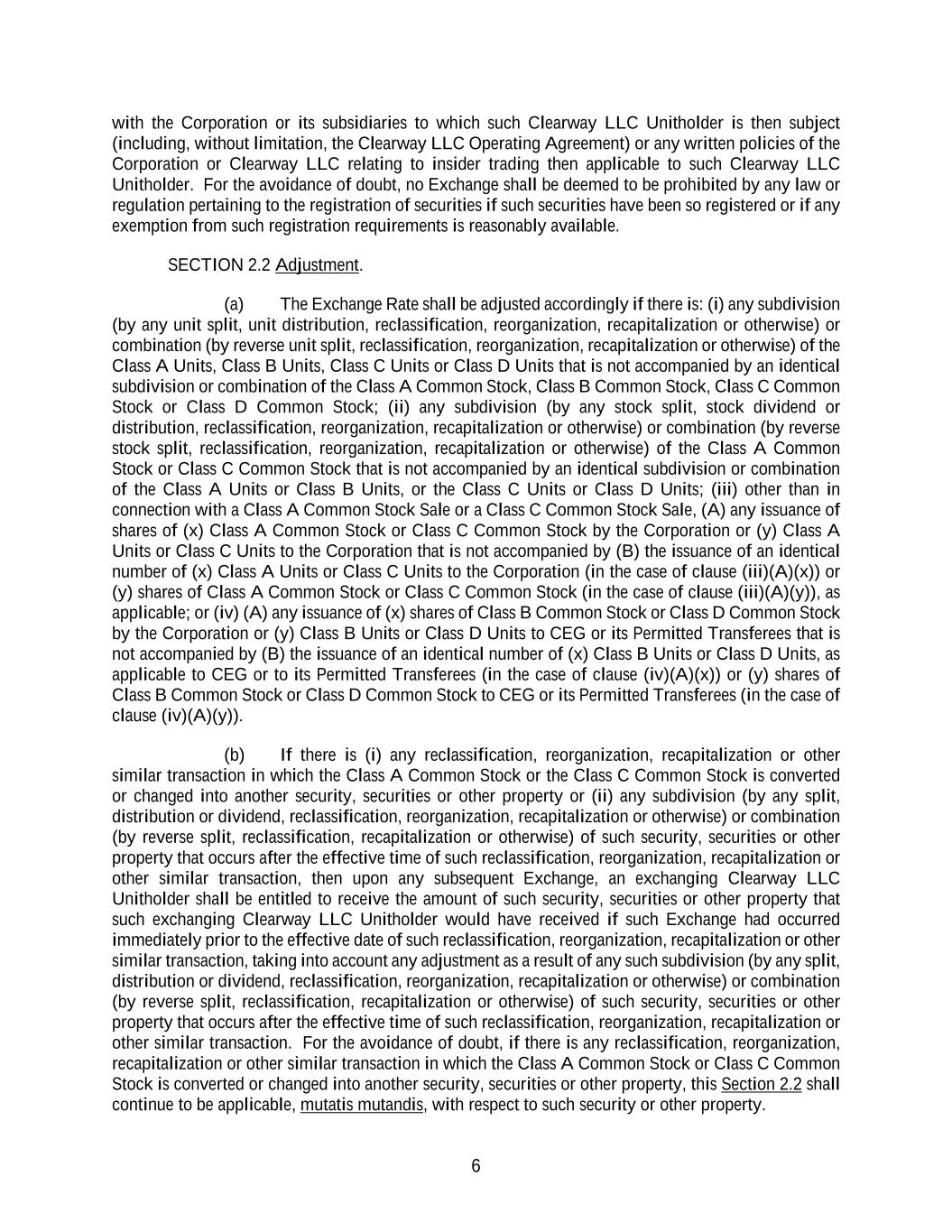 6 with the Corporation or its subsidiaries to which such Clearway LLC Unitholder is then subject (including, without limitation, the Clearway LLC Operating Agreement) or any written policies of the Corporation or Clearway LLC relating to insider trading then applicable to such Clearway LLC Unitholder. For the avoidance of doubt, no Exchange shall be deemed to be prohibited by any law or regulation pertaining to the registration of securities if such securities have been so registered or if any exemption from such registration requirements is reasonably available. SECTION 2.2 Adjustment. (a) The Exchange Rate shall be adjusted accordingly if there is: (i) any subdivision (by any unit split, unit distribution, reclassification, reorganization, recapitalization or otherwise) or combination (by reverse unit split, reclassification, reorganization, recapitalization or otherwise) of the Class A Units, Class B Units, Class C Units or Class D Units that is not accompanied by an identical subdivision or combination of the Class A Common Stock, Class B Common Stock, Class C Common Stock or Class D Common Stock; (ii) any subdivision (by any stock split, stock dividend or distribution, reclassification, reorganization, recapitalization or otherwise) or combination (by reverse stock split, reclassification, reorganization, recapitalization or otherwise) of the Class A Common Stock or Class C Common Stock that is not accompanied by an identical subdivision or combination of the Class A Units or Class B Units, or the Class C Units or Class D Units; (iii) other than in connection with a Class A Common Stock Sale or a Class C Common Stock Sale, (A) any issuance of shares of (x) Class A Common Stock or Class C Common Stock by the Corporation or (y) Class A Units or Class C Units to the Corporation that is not accompanied by (B) the issuance of an identical number of (x) Class A Units or Class C Units to the Corporation (in the case of clause (iii)(A)(x)) or (y) shares of Class A Common Stock or Class C Common Stock (in the case of clause (iii)(A)(y)), as applicable; or (iv) (A) any issuance of (x) shares of Class B Common Stock or Class D Common Stock by the Corporation or (y) Class B Units or Class D Units to CEG or its Permitted Transferees that is not accompanied by (B) the issuance of an identical number of (x) Class B Units or Class D Units, as applicable to CEG or to its Permitted Transferees (in the case of clause (iv)(A)(x)) or (y) shares of Class B Common Stock or Class D Common Stock to CEG or its Permitted Transferees (in the case of clause (iv)(A)(y)). (b) If there is (i) any reclassification, reorganization, recapitalization or other similar transaction in which the Class A Common Stock or the Class C Common Stock is converted or changed into another security, securities or other property or (ii) any subdivision (by any split, distribution or dividend, reclassification, reorganization, recapitalization or otherwise) or combination (by reverse split, reclassification, recapitalization or otherwise) of such security, securities or other property that occurs after the effective time of such reclassification, reorganization, recapitalization or other similar transaction, then upon any subsequent Exchange, an exchanging Clearway LLC Unitholder shall be entitled to receive the amount of such security, securities or other property that such exchanging Clearway LLC Unitholder would have received if such Exchange had occurred immediately prior to the effective date of such reclassification, reorganization, recapitalization or other similar transaction, taking into account any adjustment as a result of any such subdivision (by any split, distribution or dividend, reclassification, reorganization, recapitalization or otherwise) or combination (by reverse split, reclassification, recapitalization or otherwise) of such security, securities or other property that occurs after the effective time of such reclassification, reorganization, recapitalization or other similar transaction. For the avoidance of doubt, if there is any reclassification, reorganization, recapitalization or other similar transaction in which the Class A Common Stock or Class C Common Stock is converted or changed into another security, securities or other property, this Section 2.2 shall continue to be applicable, mutatis mutandis, with respect to such security or other property.