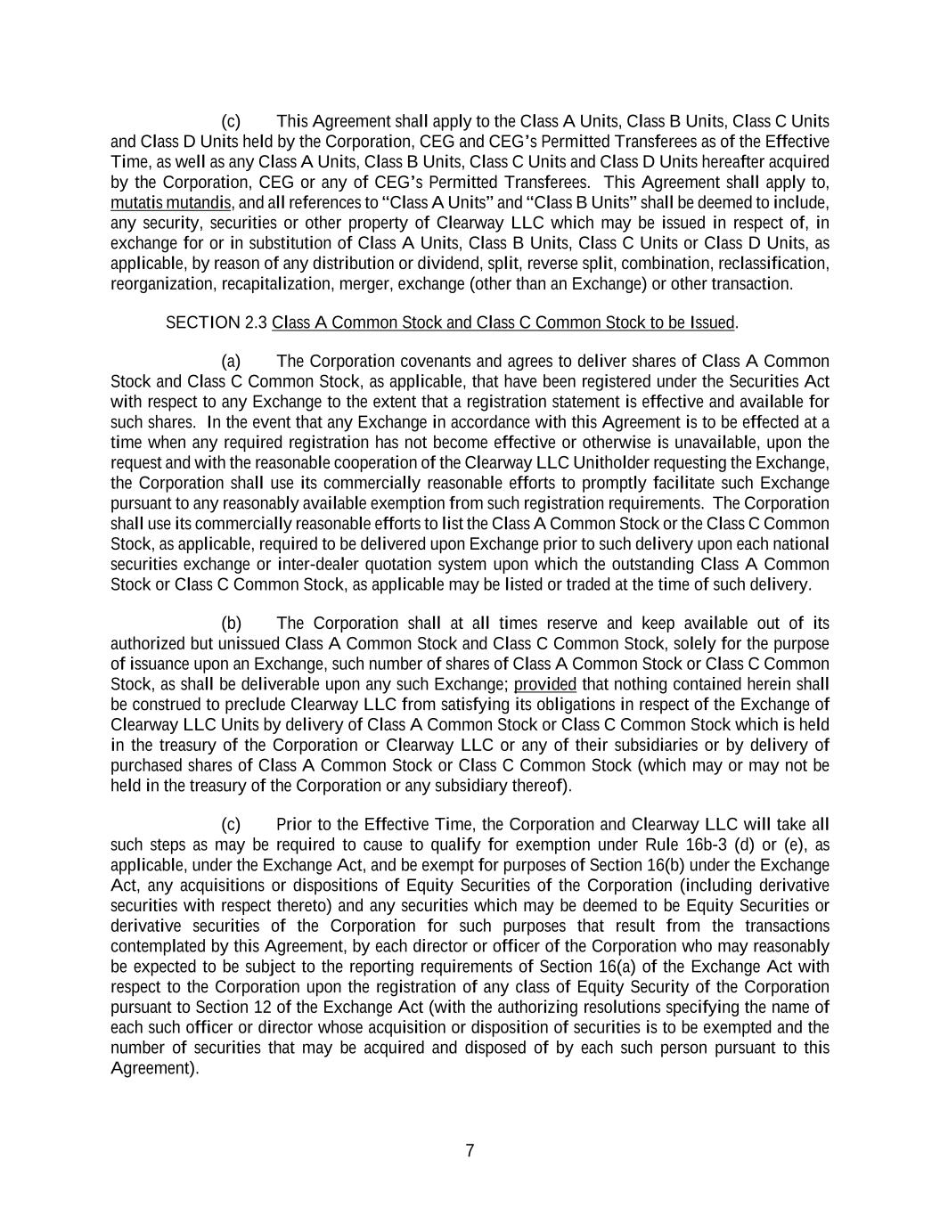 7 (c) This Agreement shall apply to the Class A Units, Class B Units, Class C Units and Class D Units held by the Corporation, CEG and CEG’s Permitted Transferees as of the Effective Time, as well as any Class A Units, Class B Units, Class C Units and Class D Units hereafter acquired by the Corporation, CEG or any of CEG’s Permitted Transferees. This Agreement shall apply to, mutatis mutandis, and all references to “Class A Units” and “Class B Units” shall be deemed to include, any security, securities or other property of Clearway LLC which may be issued in respect of, in exchange for or in substitution of Class A Units, Class B Units, Class C Units or Class D Units, as applicable, by reason of any distribution or dividend, split, reverse split, combination, reclassification, reorganization, recapitalization, merger, exchange (other than an Exchange) or other transaction. SECTION 2.3 Class A Common Stock and Class C Common Stock to be Issued. (a) The Corporation covenants and agrees to deliver shares of Class A Common Stock and Class C Common Stock, as applicable, that have been registered under the Securities Act with respect to any Exchange to the extent that a registration statement is effective and available for such shares. In the event that any Exchange in accordance with this Agreement is to be effected at a time when any required registration has not become effective or otherwise is unavailable, upon the request and with the reasonable cooperation of the Clearway LLC Unitholder requesting the Exchange, the Corporation shall use its commercially reasonable efforts to promptly facilitate such Exchange pursuant to any reasonably available exemption from such registration requirements. The Corporation shall use its commercially reasonable efforts to list the Class A Common Stock or the Class C Common Stock, as applicable, required to be delivered upon Exchange prior to such delivery upon each national securities exchange or inter-dealer quotation system upon which the outstanding Class A Common Stock or Class C Common Stock, as applicable may be listed or traded at the time of such delivery. (b) The Corporation shall at all times reserve and keep available out of its authorized but unissued Class A Common Stock and Class C Common Stock, solely for the purpose of issuance upon an Exchange, such number of shares of Class A Common Stock or Class C Common Stock, as shall be deliverable upon any such Exchange; provided that nothing contained herein shall be construed to preclude Clearway LLC from satisfying its obligations in respect of the Exchange of Clearway LLC Units by delivery of Class A Common Stock or Class C Common Stock which is held in the treasury of the Corporation or Clearway LLC or any of their subsidiaries or by delivery of purchased shares of Class A Common Stock or Class C Common Stock (which may or may not be held in the treasury of the Corporation or any subsidiary thereof). (c) Prior to the Effective Time, the Corporation and Clearway LLC will take all such steps as may be required to cause to qualify for exemption under Rule 16b-3 (d) or (e), as applicable, under the Exchange Act, and be exempt for purposes of Section 16(b) under the Exchange Act, any acquisitions or dispositions of Equity Securities of the Corporation (including derivative securities with respect thereto) and any securities which may be deemed to be Equity Securities or derivative securities of the Corporation for such purposes that result from the transactions contemplated by this Agreement, by each director or officer of the Corporation who may reasonably be expected to be subject to the reporting requirements of Section 16(a) of the Exchange Act with respect to the Corporation upon the registration of any class of Equity Security of the Corporation pursuant to Section 12 of the Exchange Act (with the authorizing resolutions specifying the name of each such officer or director whose acquisition or disposition of securities is to be exempted and the number of securities that may be acquired and disposed of by each such person pursuant to this Agreement).