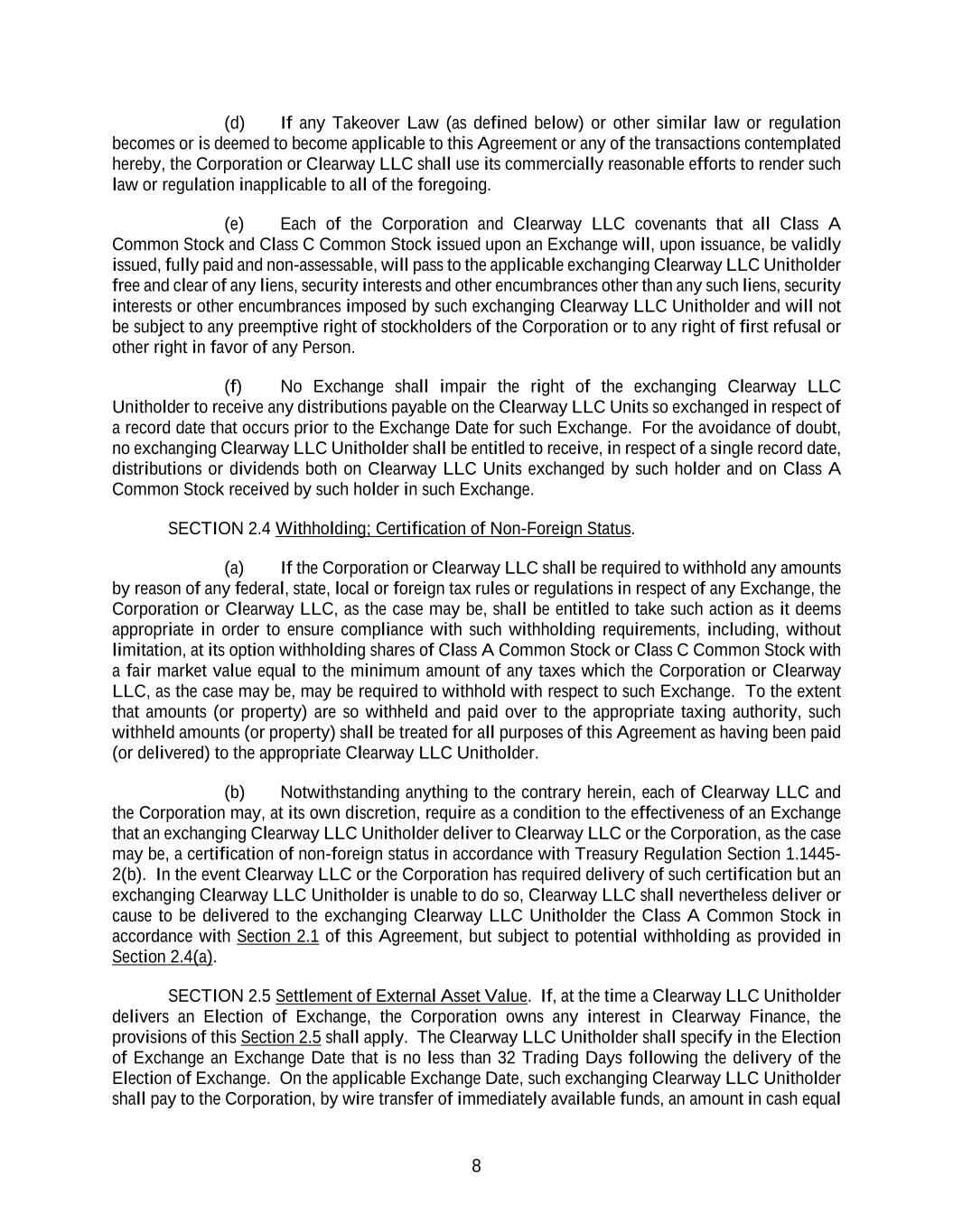8 (d) If any Takeover Law (as defined below) or other similar law or regulation becomes or is deemed to become applicable to this Agreement or any of the transactions contemplated hereby, the Corporation or Clearway LLC shall use its commercially reasonable efforts to render such law or regulation inapplicable to all of the foregoing. (e) Each of the Corporation and Clearway LLC covenants that all Class A Common Stock and Class C Common Stock issued upon an Exchange will, upon issuance, be validly issued, fully paid and non-assessable, will pass to the applicable exchanging Clearway LLC Unitholder free and clear of any liens, security interests and other encumbrances other than any such liens, security interests or other encumbrances imposed by such exchanging Clearway LLC Unitholder and will not be subject to any preemptive right of stockholders of the Corporation or to any right of first refusal or other right in favor of any Person. (f) No Exchange shall impair the right of the exchanging Clearway LLC Unitholder to receive any distributions payable on the Clearway LLC Units so exchanged in respect of a record date that occurs prior to the Exchange Date for such Exchange. For the avoidance of doubt, no exchanging Clearway LLC Unitholder shall be entitled to receive, in respect of a single record date, distributions or dividends both on Clearway LLC Units exchanged by such holder and on Class A Common Stock received by such holder in such Exchange. SECTION 2.4 Withholding; Certification of Non-Foreign Status. (a) If the Corporation or Clearway LLC shall be required to withhold any amounts by reason of any federal, state, local or foreign tax rules or regulations in respect of any Exchange, the Corporation or Clearway LLC, as the case may be, shall be entitled to take such action as it deems appropriate in order to ensure compliance with such withholding requirements, including, without limitation, at its option withholding shares of Class A Common Stock or Class C Common Stock with a fair market value equal to the minimum amount of any taxes which the Corporation or Clearway LLC, as the case may be, may be required to withhold with respect to such Exchange. To the extent that amounts (or property) are so withheld and paid over to the appropriate taxing authority, such withheld amounts (or property) shall be treated for all purposes of this Agreement as having been paid (or delivered) to the appropriate Clearway LLC Unitholder. (b) Notwithstanding anything to the contrary herein, each of Clearway LLC and the Corporation may, at its own discretion, require as a condition to the effectiveness of an Exchange that an exchanging Clearway LLC Unitholder deliver to Clearway LLC or the Corporation, as the case may be, a certification of non-foreign status in accordance with Treasury Regulation Section 1.1445- 2(b). In the event Clearway LLC or the Corporation has required delivery of such certification but an exchanging Clearway LLC Unitholder is unable to do so, Clearway LLC shall nevertheless deliver or cause to be delivered to the exchanging Clearway LLC Unitholder the Class A Common Stock in accordance with Section 2.1 of this Agreement, but subject to potential withholding as provided in Section 2.4(a). SECTION 2.5 Settlement of External Asset Value. If, at the time a Clearway LLC Unitholder delivers an Election of Exchange, the Corporation owns any interest in Clearway Finance, the provisions of this Section 2.5 shall apply. The Clearway LLC Unitholder shall specify in the Election of Exchange an Exchange Date that is no less than 32 Trading Days following the delivery of the Election of Exchange. On the applicable Exchange Date, such exchanging Clearway LLC Unitholder shall pay to the Corporation, by wire transfer of immediately available funds, an amount in cash equal
