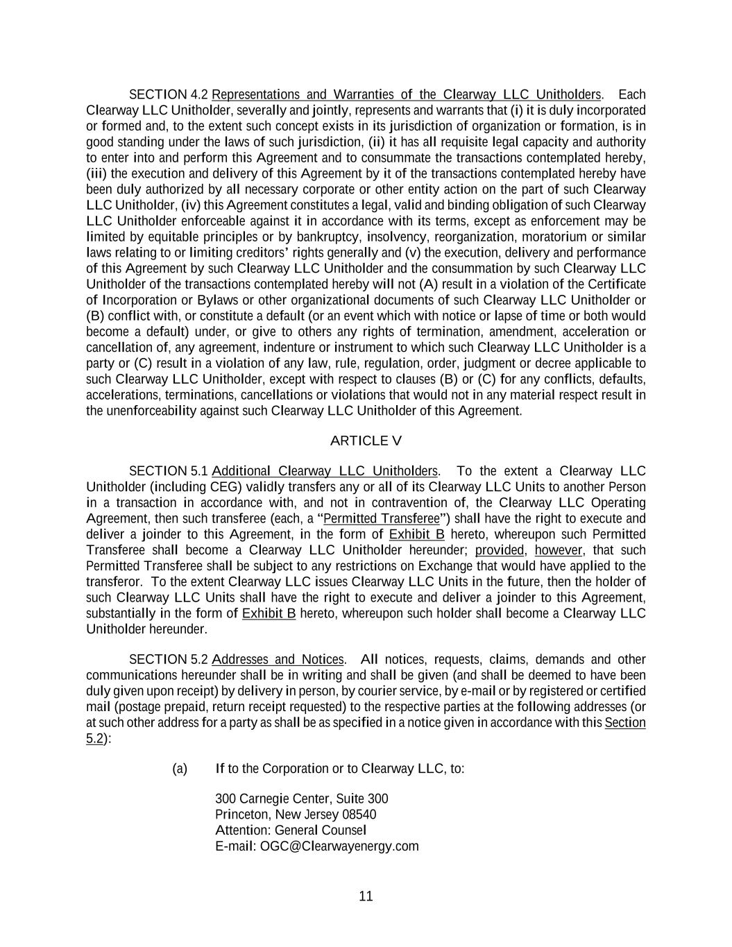 11 SECTION 4.2 Representations and Warranties of the Clearway LLC Unitholders. Each Clearway LLC Unitholder, severally and jointly, represents and warrants that (i) it is duly incorporated or formed and, to the extent such concept exists in its jurisdiction of organization or formation, is in good standing under the laws of such jurisdiction, (ii) it has all requisite legal capacity and authority to enter into and perform this Agreement and to consummate the transactions contemplated hereby, (iii) the execution and delivery of this Agreement by it of the transactions contemplated hereby have been duly authorized by all necessary corporate or other entity action on the part of such Clearway LLC Unitholder, (iv) this Agreement constitutes a legal, valid and binding obligation of such Clearway LLC Unitholder enforceable against it in accordance with its terms, except as enforcement may be limited by equitable principles or by bankruptcy, insolvency, reorganization, moratorium or similar laws relating to or limiting creditors’ rights generally and (v) the execution, delivery and performance of this Agreement by such Clearway LLC Unitholder and the consummation by such Clearway LLC Unitholder of the transactions contemplated hereby will not (A) result in a violation of the Certificate of Incorporation or Bylaws or other organizational documents of such Clearway LLC Unitholder or (B) conflict with, or constitute a default (or an event which with notice or lapse of time or both would become a default) under, or give to others any rights of termination, amendment, acceleration or cancellation of, any agreement, indenture or instrument to which such Clearway LLC Unitholder is a party or (C) result in a violation of any law, rule, regulation, order, judgment or decree applicable to such Clearway LLC Unitholder, except with respect to clauses (B) or (C) for any conflicts, defaults, accelerations, terminations, cancellations or violations that would not in any material respect result in the unenforceability against such Clearway LLC Unitholder of this Agreement. ARTICLE V SECTION 5.1 Additional Clearway LLC Unitholders. To the extent a Clearway LLC Unitholder (including CEG) validly transfers any or all of its Clearway LLC Units to another Person in a transaction in accordance with, and not in contravention of, the Clearway LLC Operating Agreement, then such transferee (each, a “Permitted Transferee”) shall have the right to execute and deliver a joinder to this Agreement, in the form of Exhibit B hereto, whereupon such Permitted Transferee shall become a Clearway LLC Unitholder hereunder; provided, however, that such Permitted Transferee shall be subject to any restrictions on Exchange that would have applied to the transferor. To the extent Clearway LLC issues Clearway LLC Units in the future, then the holder of such Clearway LLC Units shall have the right to execute and deliver a joinder to this Agreement, substantially in the form of Exhibit B hereto, whereupon such holder shall become a Clearway LLC Unitholder hereunder. SECTION 5.2 Addresses and Notices. All notices, requests, claims, demands and other communications hereunder shall be in writing and shall be given (and shall be deemed to have been duly given upon receipt) by delivery in person, by courier service, by e-mail or by registered or certified mail (postage prepaid, return receipt requested) to the respective parties at the following addresses (or at such other address for a party as shall be as specified in a notice given in accordance with this Section 5.2): (a) If to the Corporation or to Clearway LLC, to: 300 Carnegie Center, Suite 300 Princeton, New Jersey 08540 Attention: General Counsel E-mail: OGC@Clearwayenergy.com