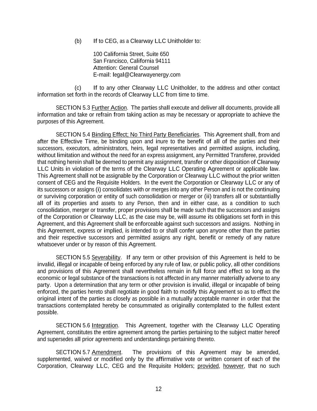 12 (b) If to CEG, as a Clearway LLC Unitholder to: 100 California Street, Suite 650 San Francisco, California 94111 Attention: General Counsel E-mail: legal@Clearwayenergy.com (c) If to any other Clearway LLC Unitholder, to the address and other contact information set forth in the records of Clearway LLC from time to time. SECTION 5.3 Further Action. The parties shall execute and deliver all documents, provide all information and take or refrain from taking action as may be necessary or appropriate to achieve the purposes of this Agreement. SECTION 5.4 Binding Effect; No Third Party Beneficiaries. This Agreement shall, from and after the Effective Time, be binding upon and inure to the benefit of all of the parties and their successors, executors, administrators, heirs, legal representatives and permitted assigns, including, without limitation and without the need for an express assignment, any Permitted Transferee, provided that nothing herein shall be deemed to permit any assignment, transfer or other disposition of Clearway LLC Units in violation of the terms of the Clearway LLC Operating Agreement or applicable law. This Agreement shall not be assignable by the Corporation or Clearway LLC without the prior written consent of CEG and the Requisite Holders. In the event the Corporation or Clearway LLC or any of its successors or assigns (i) consolidates with or merges into any other Person and is not the continuing or surviving corporation or entity of such consolidation or merger or (ii) transfers all or substantially all of its properties and assets to any Person, then and in either case, as a condition to such consolidation, merger or transfer, proper provisions shall be made such that the successors and assigns of the Corporation or Clearway LLC, as the case may be, will assume its obligations set forth in this Agreement, and this Agreement shall be enforceable against such successors and assigns. Nothing in this Agreement, express or implied, is intended to or shall confer upon anyone other than the parties and their respective successors and permitted assigns any right, benefit or remedy of any nature whatsoever under or by reason of this Agreement. SECTION 5.5 Severability. If any term or other provision of this Agreement is held to be invalid, illegal or incapable of being enforced by any rule of law, or public policy, all other conditions and provisions of this Agreement shall nevertheless remain in full force and effect so long as the economic or legal substance of the transactions is not affected in any manner materially adverse to any party. Upon a determination that any term or other provision is invalid, illegal or incapable of being enforced, the parties hereto shall negotiate in good faith to modify this Agreement so as to effect the original intent of the parties as closely as possible in a mutually acceptable manner in order that the transactions contemplated hereby be consummated as originally contemplated to the fullest extent possible. SECTION 5.6 Integration. This Agreement, together with the Clearway LLC Operating Agreement, constitutes the entire agreement among the parties pertaining to the subject matter hereof and supersedes all prior agreements and understandings pertaining thereto. SECTION 5.7 Amendment. The provisions of this Agreement may be amended, supplemented, waived or modified only by the affirmative vote or written consent of each of the Corporation, Clearway LLC, CEG and the Requisite Holders; provided, however, that no such