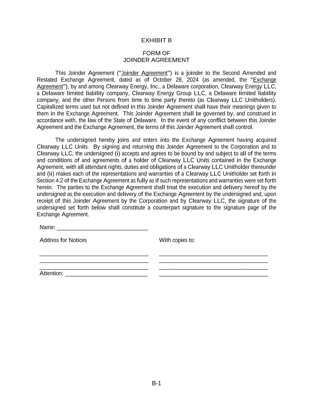 B-1 EXHIBIT B FORM OF JOINDER AGREEMENT This Joinder Agreement (“Joinder Agreement”) is a joinder to the Second Amended and Restated Exchange Agreement, dated as of October 28, 2024 (as amended, the “Exchange Agreement”), by and among Clearway Energy, Inc., a Delaware corporation, Clearway Energy LLC, a Delaware limited liability company, Clearway Energy Group LLC, a Delaware limited liability company, and the other Persons from time to time party thereto (as Clearway LLC Unitholders). Capitalized terms used but not defined in this Joinder Agreement shall have their meanings given to them in the Exchange Agreement. This Joinder Agreement shall be governed by, and construed in accordance with, the law of the State of Delaware. In the event of any conflict between this Joinder Agreement and the Exchange Agreement, the terms of this Joinder Agreement shall control. The undersigned hereby joins and enters into the Exchange Agreement having acquired Clearway LLC Units. By signing and returning this Joinder Agreement to the Corporation and to Clearway LLC, the undersigned (i) accepts and agrees to be bound by and subject to all of the terms and conditions of and agreements of a holder of Clearway LLC Units contained in the Exchange Agreement, with all attendant rights, duties and obligations of a Clearway LLC Unitholder thereunder and (ii) makes each of the representations and warranties of a Clearway LLC Unitholder set forth in Section 4.2 of the Exchange Agreement as fully as if such representations and warranties were set forth herein. The parties to the Exchange Agreement shall treat the execution and delivery hereof by the undersigned as the execution and delivery of the Exchange Agreement by the undersigned and, upon receipt of this Joinder Agreement by the Corporation and by Clearway LLC, the signature of the undersigned set forth below shall constitute a counterpart signature to the signature page of the Exchange Agreement. Name: _______________________________ Address for Notices With copies to: _____________________________________ _____________________________________ _____________________________________ _____________________________________ _____________________________________ _____________________________________ Attention: ____________________________ _____________________________________