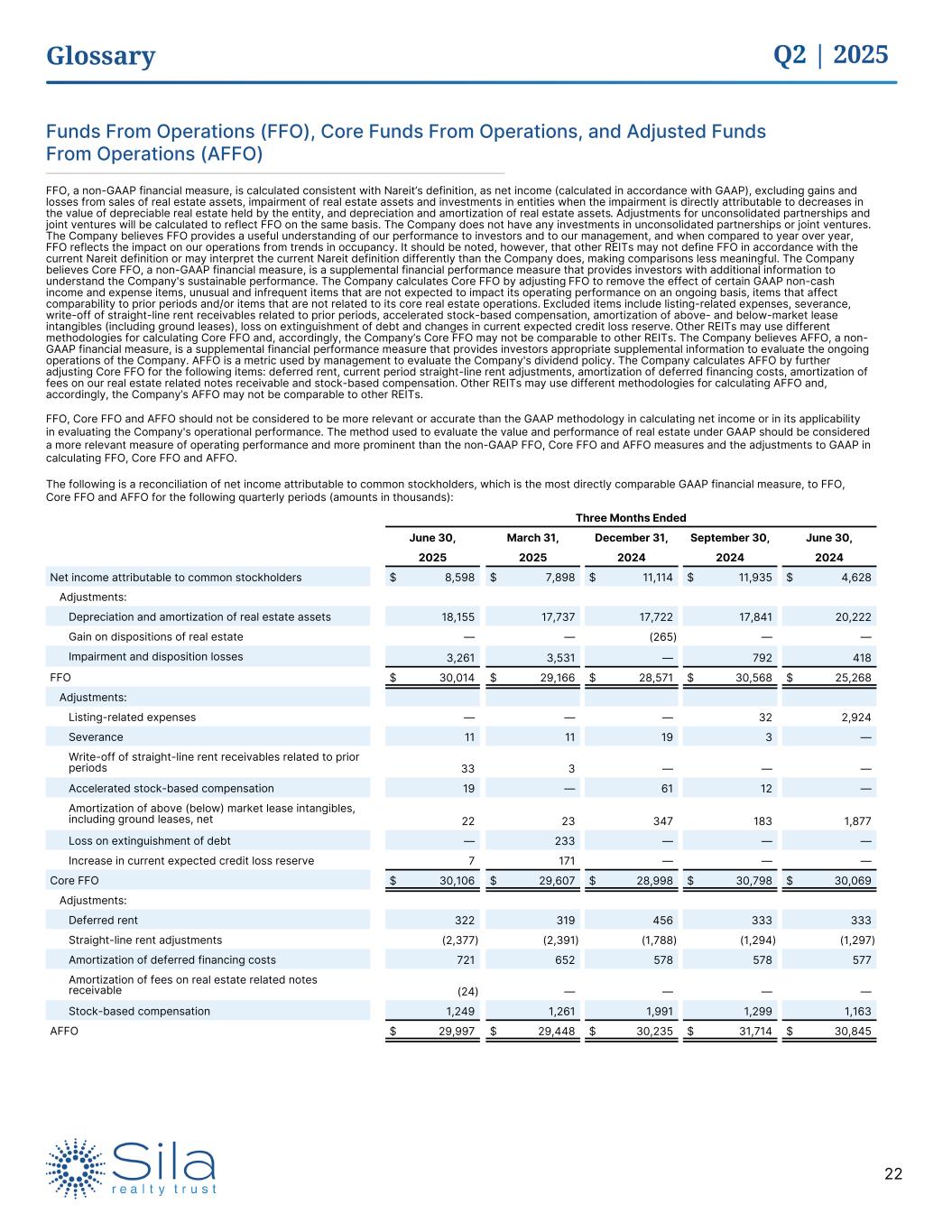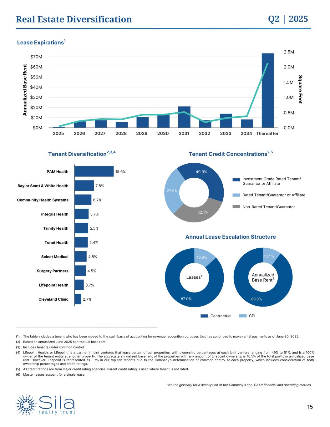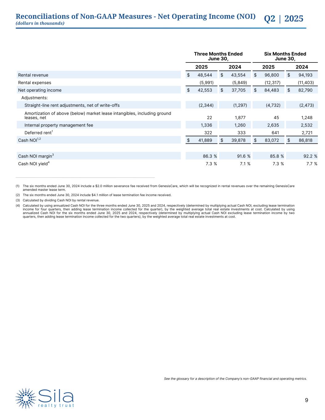 Q2 | 2025 2 Table of Contents Supplemental Information as of June 30, 2025 Corporate Address 1001 Water Street Suite 800 Tampa, FL 33602 Transfer Agent By Regular Mail: Computershare P.O. Box 43007 Providence, RI 02940-3007 By Overnight Delivery: Computershare 150 Royall Street, Suite 101 Canton, MA 02021 Contact Information Investor Support 833.404.4107 Miles Callahan, SVP, Capital Markets and Investor Relations IR@silarealtytrust.com www.SilaRealtyTrust.com 3 Quarterly Financial Summary 4 Financial Statistics and Ratios 5 Condensed Consolidated Balance Sheets 6 Condensed Consolidated Statements of Income 7 Reconciliations of Non-GAAP Measures - FFO, Core FFO, and AFFO 8 Reconciliations of Non-GAAP Measures - EBITDA and EBITDAre 9 Reconciliations of Non-GAAP Measures - Net Operating Income (NOI) 10 Same Store Cash NOI and Leasing Trends 11 Debt 12 Acquisitions and Dispositions 13 Property Map 14 Real Estate Diversification 17 Portfolio 21 Glossary Pictured Above: Fort Smith Healthcare Facility