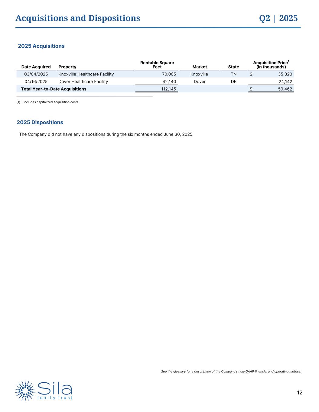 Q2 | 2025 12 See the glossary for a description of the Company's non-GAAP financial and operating metrics. Acquisitions and Dispositions 2025 Acquisitions Date Acquired Property Rentable Square Feet Market State Acquisition Price1 (in thousands) 03/04/2025 Knoxville Healthcare Facility 70,005 Knoxville TN $ 35,320 04/16/2025 Dover Healthcare Facility 42,140 Dover DE 24,142 Total Year-to-Date Acquisitions 112,145 $ 59,462 (1) Includes capitalized acquisition costs. 2025 Dispositions The Company did not have any dispositions during the six months ended June 30, 2025.