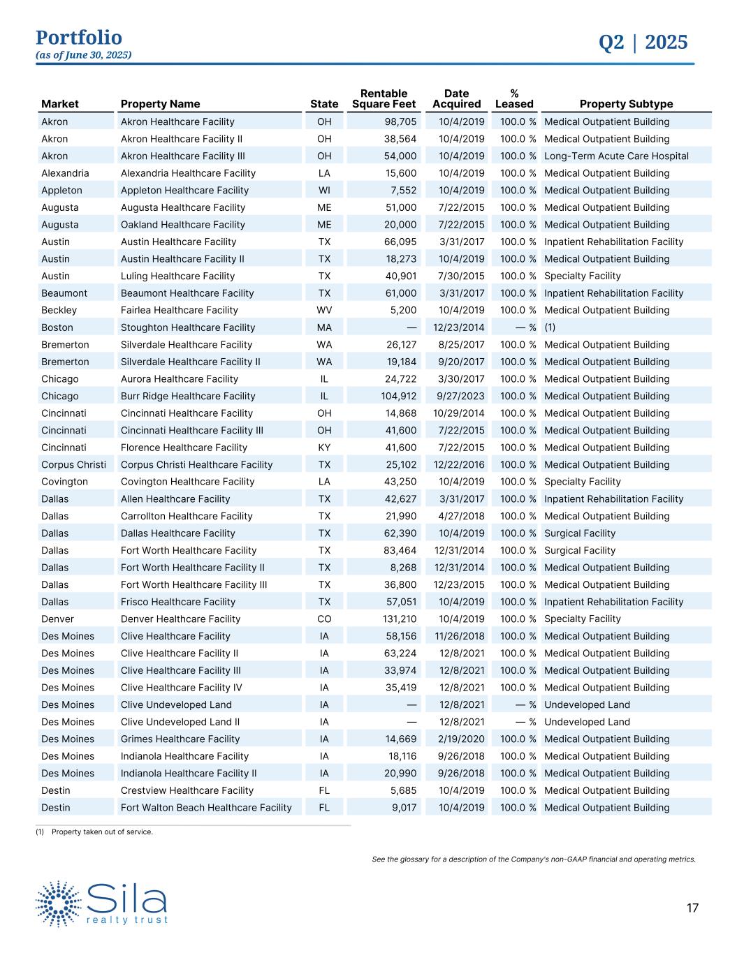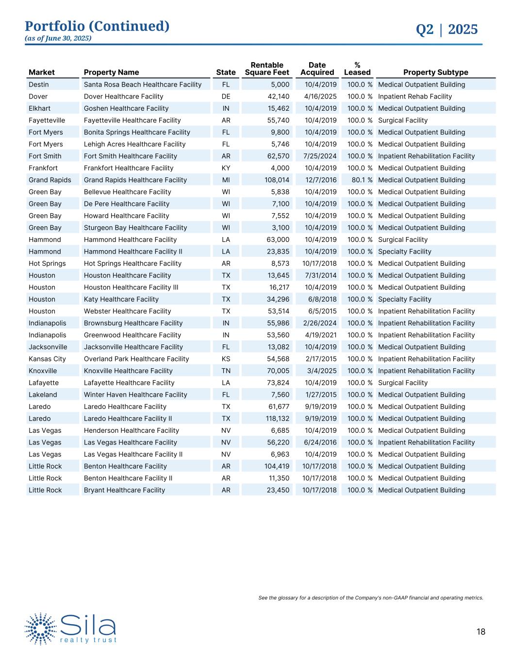 Q2 | 2025 17 Portfolio (as of June 30, 2025) See the glossary for a description of the Company's non-GAAP financial and operating metrics. Market Property Name State Rentable Square Feet Date Acquired % Leased Property Subtype Akron Akron Healthcare Facility OH 98,705 10/4/2019 100.0 % Medical Outpatient Building Akron Akron Healthcare Facility II OH 38,564 10/4/2019 100.0 % Medical Outpatient Building Akron Akron Healthcare Facility III OH 54,000 10/4/2019 100.0 % Long-Term Acute Care Hospital Alexandria Alexandria Healthcare Facility LA 15,600 10/4/2019 100.0 % Medical Outpatient Building Appleton Appleton Healthcare Facility WI 7,552 10/4/2019 100.0 % Medical Outpatient Building Augusta Augusta Healthcare Facility ME 51,000 7/22/2015 100.0 % Medical Outpatient Building Augusta Oakland Healthcare Facility ME 20,000 7/22/2015 100.0 % Medical Outpatient Building Austin Austin Healthcare Facility TX 66,095 3/31/2017 100.0 % Inpatient Rehabilitation Facility Austin Austin Healthcare Facility II TX 18,273 10/4/2019 100.0 % Medical Outpatient Building Austin Luling Healthcare Facility TX 40,901 7/30/2015 100.0 % Specialty Facility Beaumont Beaumont Healthcare Facility TX 61,000 3/31/2017 100.0 % Inpatient Rehabilitation Facility Beckley Fairlea Healthcare Facility WV 5,200 10/4/2019 100.0 % Medical Outpatient Building Boston Stoughton Healthcare Facility MA — 12/23/2014 — % (1) Bremerton Silverdale Healthcare Facility WA 26,127 8/25/2017 100.0 % Medical Outpatient Building Bremerton Silverdale Healthcare Facility II WA 19,184 9/20/2017 100.0 % Medical Outpatient Building Chicago Aurora Healthcare Facility IL 24,722 3/30/2017 100.0 % Medical Outpatient Building Chicago Burr Ridge Healthcare Facility IL 104,912 9/27/2023 100.0 % Medical Outpatient Building Cincinnati Cincinnati Healthcare Facility OH 14,868 10/29/2014 100.0 % Medical Outpatient Building Cincinnati Cincinnati Healthcare Facility III OH 41,600 7/22/2015 100.0 % Medical Outpatient Building Cincinnati Florence Healthcare Facility KY 41,600 7/22/2015 100.0 % Medical Outpatient Building Corpus Christi Corpus Christi Healthcare Facility TX 25,102 12/22/2016 100.0 % Medical Outpatient Building Covington Covington Healthcare Facility LA 43,250 10/4/2019 100.0 % Specialty Facility Dallas Allen Healthcare Facility TX 42,627 3/31/2017 100.0 % Inpatient Rehabilitation Facility Dallas Carrollton Healthcare Facility TX 21,990 4/27/2018 100.0 % Medical Outpatient Building Dallas Dallas Healthcare Facility TX 62,390 10/4/2019 100.0 % Surgical Facility Dallas Fort Worth Healthcare Facility TX 83,464 12/31/2014 100.0 % Surgical Facility Dallas Fort Worth Healthcare Facility II TX 8,268 12/31/2014 100.0 % Medical Outpatient Building Dallas Fort Worth Healthcare Facility III TX 36,800 12/23/2015 100.0 % Medical Outpatient Building Dallas Frisco Healthcare Facility TX 57,051 10/4/2019 100.0 % Inpatient Rehabilitation Facility Denver Denver Healthcare Facility CO 131,210 10/4/2019 100.0 % Specialty Facility Des Moines Clive Healthcare Facility IA 58,156 11/26/2018 100.0 % Medical Outpatient Building Des Moines Clive Healthcare Facility II IA 63,224 12/8/2021 100.0 % Medical Outpatient Building Des Moines Clive Healthcare Facility III IA 33,974 12/8/2021 100.0 % Medical Outpatient Building Des Moines Clive Healthcare Facility IV IA 35,419 12/8/2021 100.0 % Medical Outpatient Building Des Moines Clive Undeveloped Land IA — 12/8/2021 — % Undeveloped Land Des Moines Clive Undeveloped Land II IA — 12/8/2021 — % Undeveloped Land Des Moines Grimes Healthcare Facility IA 14,669 2/19/2020 100.0 % Medical Outpatient Building Des Moines Indianola Healthcare Facility IA 18,116 9/26/2018 100.0 % Medical Outpatient Building Des Moines Indianola Healthcare Facility II IA 20,990 9/26/2018 100.0 % Medical Outpatient Building Destin Crestview Healthcare Facility FL 5,685 10/4/2019 100.0 % Medical Outpatient Building Destin Fort Walton Beach Healthcare Facility FL 9,017 10/4/2019 100.0 % Medical Outpatient Building (1) Property taken out of service.