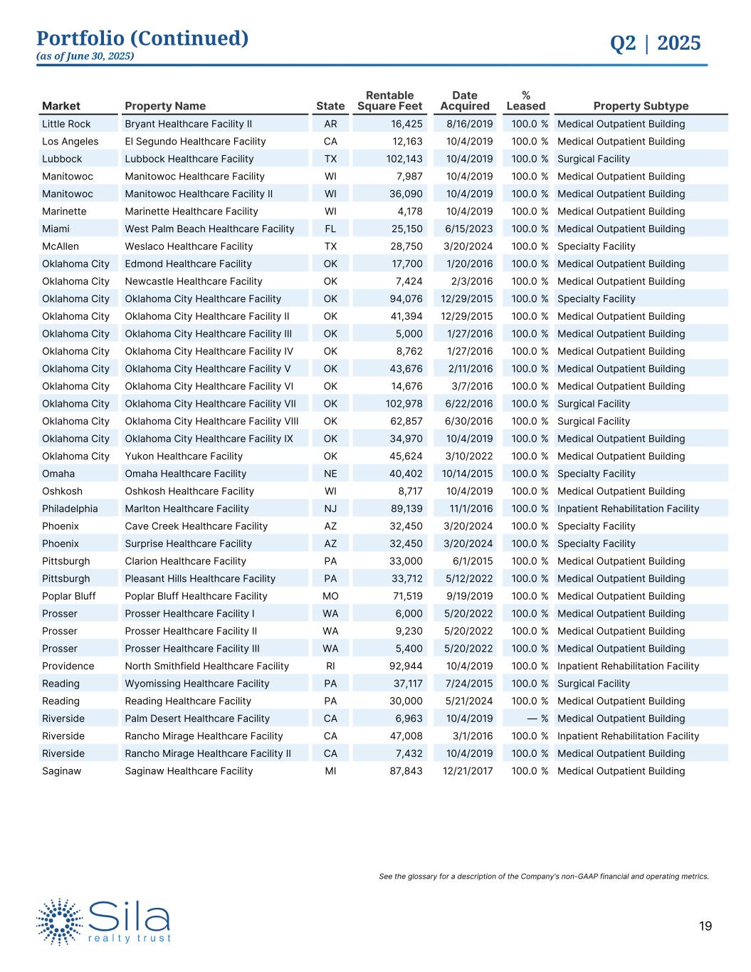Q2 | 2025 18 Portfolio (Continued) (as of June 30, 2025) See the glossary for a description of the Company's non-GAAP financial and operating metrics. Market Property Name State Rentable Square Feet Date Acquired % Leased Property Subtype Destin Santa Rosa Beach Healthcare Facility FL 5,000 10/4/2019 100.0 % Medical Outpatient Building Dover Dover Healthcare Facility DE 42,140 4/16/2025 100.0 % Inpatient Rehab Facility Elkhart Goshen Healthcare Facility IN 15,462 10/4/2019 100.0 % Medical Outpatient Building Fayetteville Fayetteville Healthcare Facility AR 55,740 10/4/2019 100.0 % Surgical Facility Fort Myers Bonita Springs Healthcare Facility FL 9,800 10/4/2019 100.0 % Medical Outpatient Building Fort Myers Lehigh Acres Healthcare Facility FL 5,746 10/4/2019 100.0 % Medical Outpatient Building Fort Smith Fort Smith Healthcare Facility AR 62,570 7/25/2024 100.0 % Inpatient Rehabilitation Facility Frankfort Frankfort Healthcare Facility KY 4,000 10/4/2019 100.0 % Medical Outpatient Building Grand Rapids Grand Rapids Healthcare Facility MI 108,014 12/7/2016 80.1 % Medical Outpatient Building Green Bay Bellevue Healthcare Facility WI 5,838 10/4/2019 100.0 % Medical Outpatient Building Green Bay De Pere Healthcare Facility WI 7,100 10/4/2019 100.0 % Medical Outpatient Building Green Bay Howard Healthcare Facility WI 7,552 10/4/2019 100.0 % Medical Outpatient Building Green Bay Sturgeon Bay Healthcare Facility WI 3,100 10/4/2019 100.0 % Medical Outpatient Building Hammond Hammond Healthcare Facility LA 63,000 10/4/2019 100.0 % Surgical Facility Hammond Hammond Healthcare Facility II LA 23,835 10/4/2019 100.0 % Specialty Facility Hot Springs Hot Springs Healthcare Facility AR 8,573 10/17/2018 100.0 % Medical Outpatient Building Houston Houston Healthcare Facility TX 13,645 7/31/2014 100.0 % Medical Outpatient Building Houston Houston Healthcare Facility III TX 16,217 10/4/2019 100.0 % Medical Outpatient Building Houston Katy Healthcare Facility TX 34,296 6/8/2018 100.0 % Specialty Facility Houston Webster Healthcare Facility TX 53,514 6/5/2015 100.0 % Inpatient Rehabilitation Facility Indianapolis Brownsburg Healthcare Facility IN 55,986 2/26/2024 100.0 % Inpatient Rehabilitation Facility Indianapolis Greenwood Healthcare Facility IN 53,560 4/19/2021 100.0 % Inpatient Rehabilitation Facility Jacksonville Jacksonville Healthcare Facility FL 13,082 10/4/2019 100.0 % Medical Outpatient Building Kansas City Overland Park Healthcare Facility KS 54,568 2/17/2015 100.0 % Inpatient Rehabilitation Facility Knoxville Knoxville Healthcare Facility TN 70,005 3/4/2025 100.0 % Inpatient Rehabilitation Facility Lafayette Lafayette Healthcare Facility LA 73,824 10/4/2019 100.0 % Surgical Facility Lakeland Winter Haven Healthcare Facility FL 7,560 1/27/2015 100.0 % Medical Outpatient Building Laredo Laredo Healthcare Facility TX 61,677 9/19/2019 100.0 % Medical Outpatient Building Laredo Laredo Healthcare Facility II TX 118,132 9/19/2019 100.0 % Medical Outpatient Building Las Vegas Henderson Healthcare Facility NV 6,685 10/4/2019 100.0 % Medical Outpatient Building Las Vegas Las Vegas Healthcare Facility NV 56,220 6/24/2016 100.0 % Inpatient Rehabilitation Facility Las Vegas Las Vegas Healthcare Facility II NV 6,963 10/4/2019 100.0 % Medical Outpatient Building Little Rock Benton Healthcare Facility AR 104,419 10/17/2018 100.0 % Medical Outpatient Building Little Rock Benton Healthcare Facility II AR 11,350 10/17/2018 100.0 % Medical Outpatient Building Little Rock Bryant Healthcare Facility AR 23,450 10/17/2018 100.0 % Medical Outpatient Building