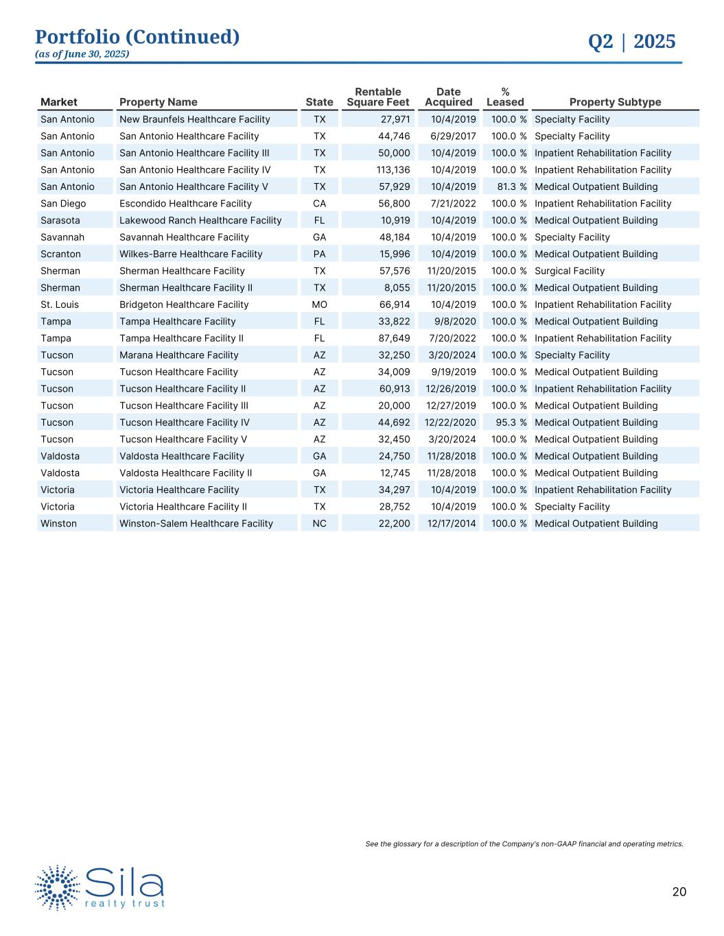Q2 | 2025 19 Portfolio (Continued) (as of June 30, 2025) See the glossary for a description of the Company's non-GAAP financial and operating metrics. Market Property Name State Rentable Square Feet Date Acquired % Leased Property Subtype Little Rock Bryant Healthcare Facility II AR 16,425 8/16/2019 100.0 % Medical Outpatient Building Los Angeles El Segundo Healthcare Facility CA 12,163 10/4/2019 100.0 % Medical Outpatient Building Lubbock Lubbock Healthcare Facility TX 102,143 10/4/2019 100.0 % Surgical Facility Manitowoc Manitowoc Healthcare Facility WI 7,987 10/4/2019 100.0 % Medical Outpatient Building Manitowoc Manitowoc Healthcare Facility II WI 36,090 10/4/2019 100.0 % Medical Outpatient Building Marinette Marinette Healthcare Facility WI 4,178 10/4/2019 100.0 % Medical Outpatient Building Miami West Palm Beach Healthcare Facility FL 25,150 6/15/2023 100.0 % Medical Outpatient Building McAllen Weslaco Healthcare Facility TX 28,750 3/20/2024 100.0 % Specialty Facility Oklahoma City Edmond Healthcare Facility OK 17,700 1/20/2016 100.0 % Medical Outpatient Building Oklahoma City Newcastle Healthcare Facility OK 7,424 2/3/2016 100.0 % Medical Outpatient Building Oklahoma City Oklahoma City Healthcare Facility OK 94,076 12/29/2015 100.0 % Specialty Facility Oklahoma City Oklahoma City Healthcare Facility II OK 41,394 12/29/2015 100.0 % Medical Outpatient Building Oklahoma City Oklahoma City Healthcare Facility III OK 5,000 1/27/2016 100.0 % Medical Outpatient Building Oklahoma City Oklahoma City Healthcare Facility IV OK 8,762 1/27/2016 100.0 % Medical Outpatient Building Oklahoma City Oklahoma City Healthcare Facility V OK 43,676 2/11/2016 100.0 % Medical Outpatient Building Oklahoma City Oklahoma City Healthcare Facility VI OK 14,676 3/7/2016 100.0 % Medical Outpatient Building Oklahoma City Oklahoma City Healthcare Facility VII OK 102,978 6/22/2016 100.0 % Surgical Facility Oklahoma City Oklahoma City Healthcare Facility VIII OK 62,857 6/30/2016 100.0 % Surgical Facility Oklahoma City Oklahoma City Healthcare Facility IX OK 34,970 10/4/2019 100.0 % Medical Outpatient Building Oklahoma City Yukon Healthcare Facility OK 45,624 3/10/2022 100.0 % Medical Outpatient Building Omaha Omaha Healthcare Facility NE 40,402 10/14/2015 100.0 % Specialty Facility Oshkosh Oshkosh Healthcare Facility WI 8,717 10/4/2019 100.0 % Medical Outpatient Building Philadelphia Marlton Healthcare Facility NJ 89,139 11/1/2016 100.0 % Inpatient Rehabilitation Facility Phoenix Cave Creek Healthcare Facility AZ 32,450 3/20/2024 100.0 % Specialty Facility Phoenix Surprise Healthcare Facility AZ 32,450 3/20/2024 100.0 % Specialty Facility Pittsburgh Clarion Healthcare Facility PA 33,000 6/1/2015 100.0 % Medical Outpatient Building Pittsburgh Pleasant Hills Healthcare Facility PA 33,712 5/12/2022 100.0 % Medical Outpatient Building Poplar Bluff Poplar Bluff Healthcare Facility MO 71,519 9/19/2019 100.0 % Medical Outpatient Building Prosser Prosser Healthcare Facility I WA 6,000 5/20/2022 100.0 % Medical Outpatient Building Prosser Prosser Healthcare Facility II WA 9,230 5/20/2022 100.0 % Medical Outpatient Building Prosser Prosser Healthcare Facility III WA 5,400 5/20/2022 100.0 % Medical Outpatient Building Providence North Smithfield Healthcare Facility RI 92,944 10/4/2019 100.0 % Inpatient Rehabilitation Facility Reading Wyomissing Healthcare Facility PA 37,117 7/24/2015 100.0 % Surgical Facility Reading Reading Healthcare Facility PA 30,000 5/21/2024 100.0 % Medical Outpatient Building Riverside Palm Desert Healthcare Facility CA 6,963 10/4/2019 — % Medical Outpatient Building Riverside Rancho Mirage Healthcare Facility CA 47,008 3/1/2016 100.0 % Inpatient Rehabilitation Facility Riverside Rancho Mirage Healthcare Facility II CA 7,432 10/4/2019 100.0 % Medical Outpatient Building Saginaw Saginaw Healthcare Facility MI 87,843 12/21/2017 100.0 % Medical Outpatient Building